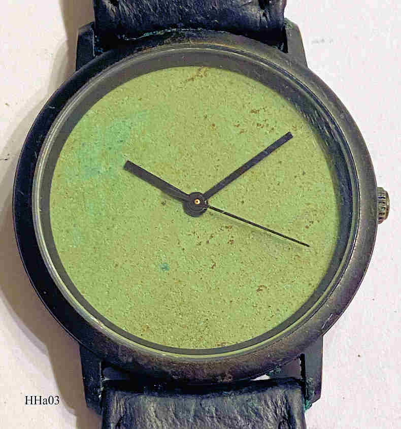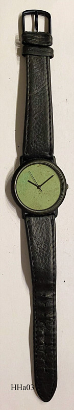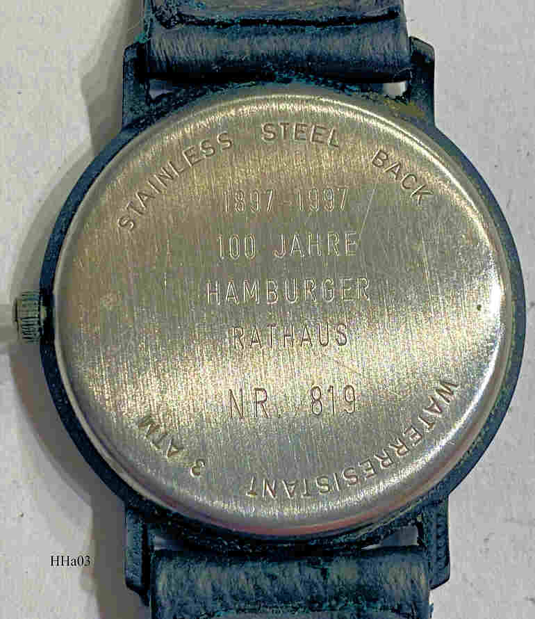 Eine Motivuhr zum 100jährigen Bestehen des Hamburger Rathauses 1997. Das Zifferblatt besteht aus Oxydiertem Kupfer aus dem Rathaus Dach. Beschriftet vorn: “ ”, hinten: ”Stainless Steel Back, Water Resistant 3 ATM, Gravur: 1897 - 1997, 100 Jahre, Hamburger, Rathaus, Nr.: 819”, innen: “Swiss Parts, Ronda, 1 One Jewel, 763, LFB”, Schwarzes Lederarmband