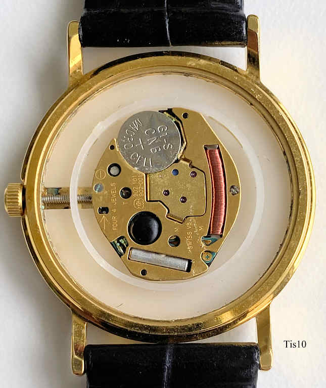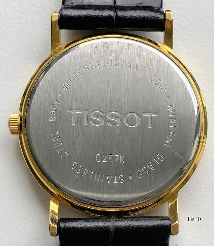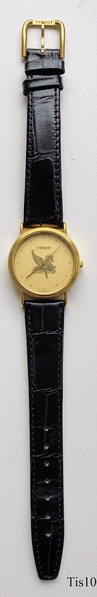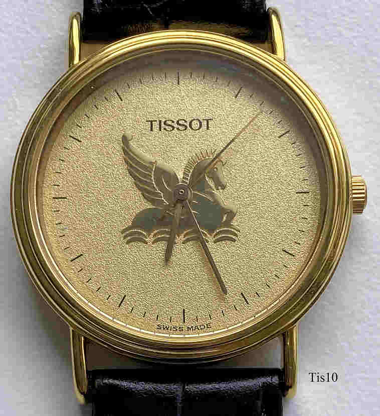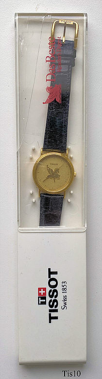 Eine Werbeuhr der Firma Readers Digest, hergestellt von Tissot. Die Uhr trägt auf dem Zifferblatt das Readers Digest Logo, den Pegasus. Beschriftet vorn: ”Tissot, Swiss Made”, hinten: ”Tissot, Stainless Steel Back, Waterresistant 30M, Mineral Glass, C257K”, innen: “Four 4 Jewels, ETA, 902.101, 902.001, Swiss V8”. Kaliber ETA 902.101
