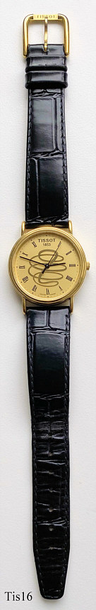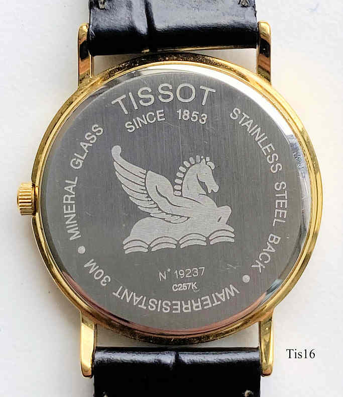 Eine Werbeuhr der Firma Readers Digest, hergestellt von Tissot. Die Uhr trägt auf dem Boden das Readers Digest Logo, den Pegasus. Beschriftet vorn: ”Tissot, 1853, Swiss Made”, hinten: ”Tissot, since 1853, Stainless Steel Back, Waterresistant 30M, Mineral Glass, N°19237, C257K”, innen: ”Four 4 Jewels, ETA 902.101, Swiss V8”, Kaliber ETA 902.101