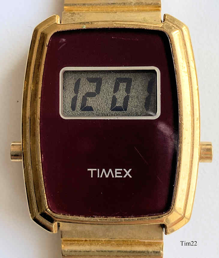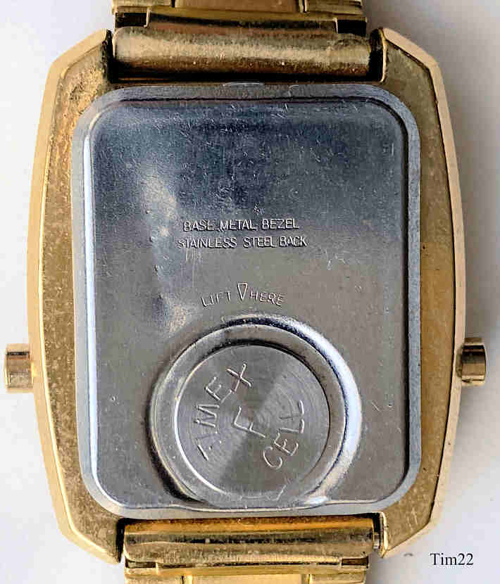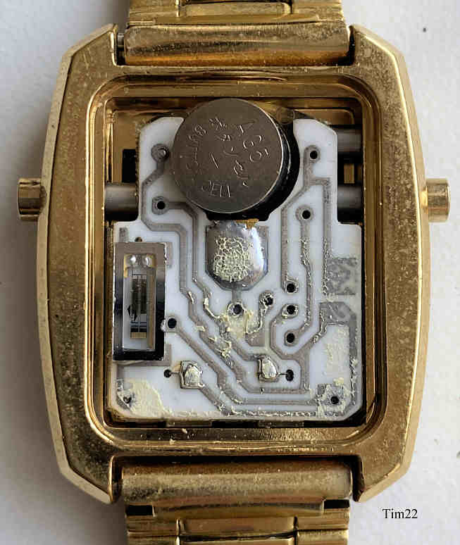 A Timex LCD watch. Signed front: ”Timex, back: ”Timex F Cell, Base Metal Bezel, Stainless Steel Back”. Inside: ” , inside the Back: ”Case, Great Britain, Timex”. On the inside left of the IC you see the transparent capsuled tuning fork quartz.