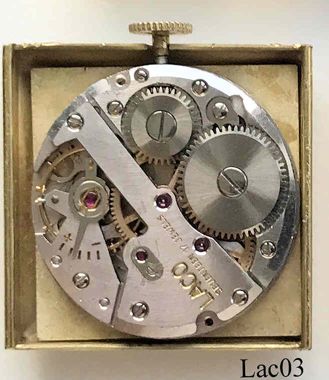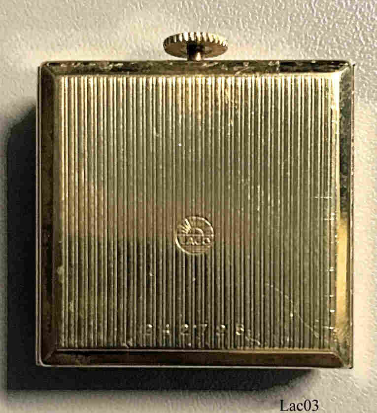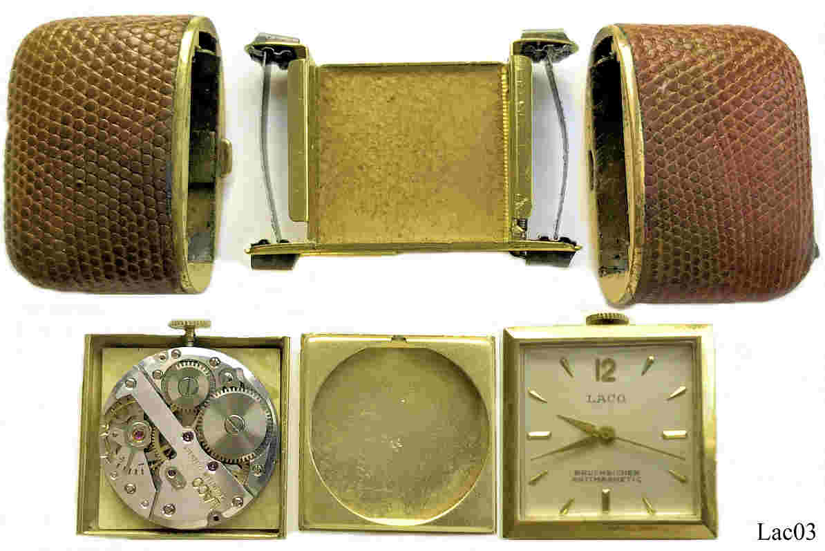 Dies ist eine Laco Taschen bzw. Reiseuhr, sie verwendet ein Durowe Handaufzugswerk, Caliber Durowe 430. Die Uhr ist in eine Leder bezogene Cassette eingebaut, die durch verschieben geöffnet wird. Die Uhr hat ein schlichtes vergoldetes Gehäuse. Beschriftet vorn: “Laco, Bruchsicher, Antimagnetic”, hinten: “Laco Logo, 242726”, innen: “Laco, seventeen 17 Jewels, 430”, auf dem Cassettenrand: “US.Pat. 2640668, US.Pat. 2719402”.
