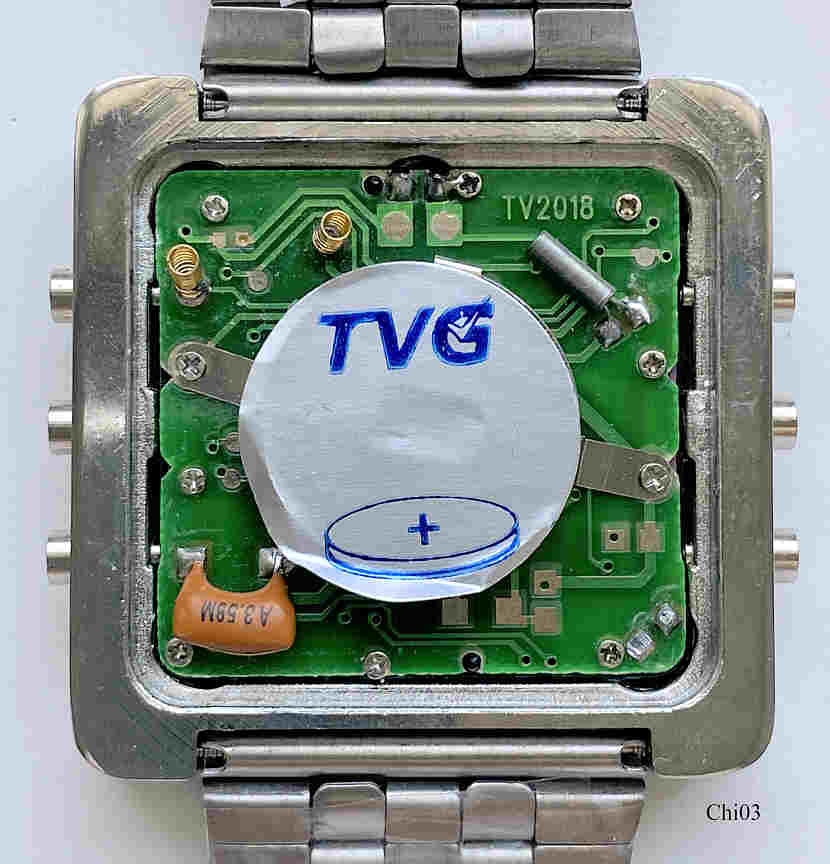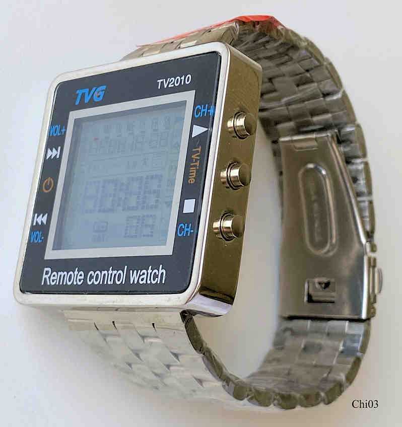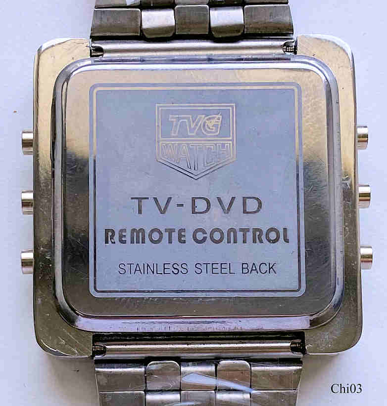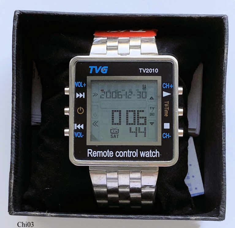ine moderne LCD Digitaluhr mit eingebauter Fernbedienung für Fernseher und DVD Player. Oberhalb der ”TVG”€ ist seitlich eine Infrarot LED eingebaut, die das Signal übermittelt. Die Uhr stammt aus Hong Kong, interessant auch die Ähnlichkeit des Firmenlogos mit TAG Heuer, sicher kein Zufall. Edelstahl Gehäuse mit Edelstahl Armband.