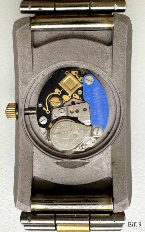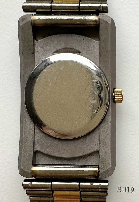 This is a Bifora ladies quartz watch, using a PUW 500 movement and relates to the India manufacturing. Gun metal case, white dial, two points at twelve with central seconds hand. Signed front: ” BIFORA, Quartz”, back: ” ”, inside: “Unadjusted, PUW 500, five (5) Jewels”. Integrated titanium / gold metal band.