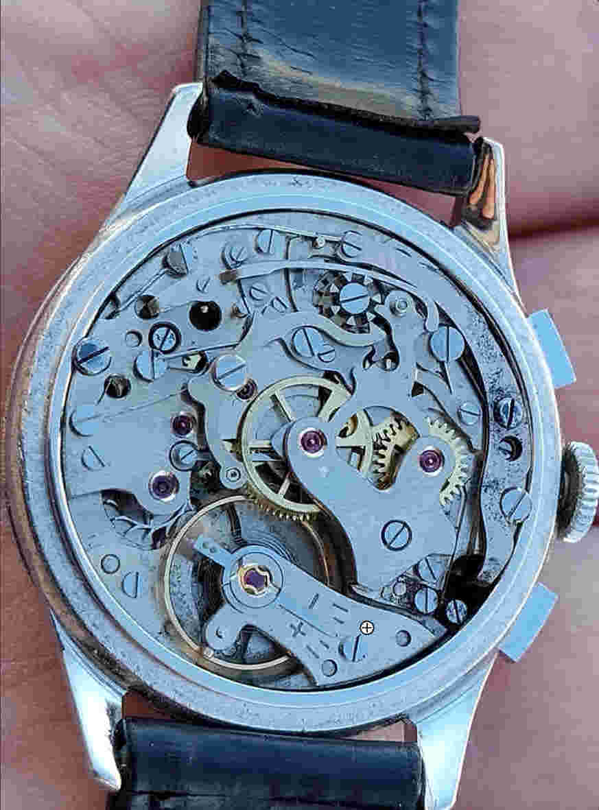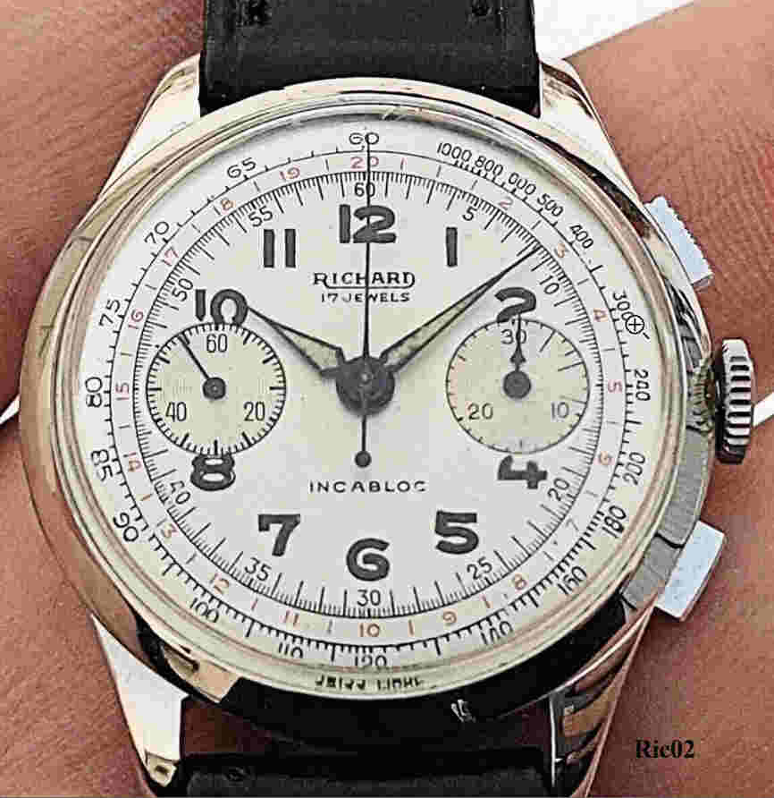 A mechanical Chronograph from the Brand Richard SA. Signed front: “Richard, 17 Jewels, Incablock”, back: ”Antimagnetic, Shock Absorber, Stainless Steel Back, Richard, Chronographe, 73370, 90, A“. Valjoux Caliber 92 movement.