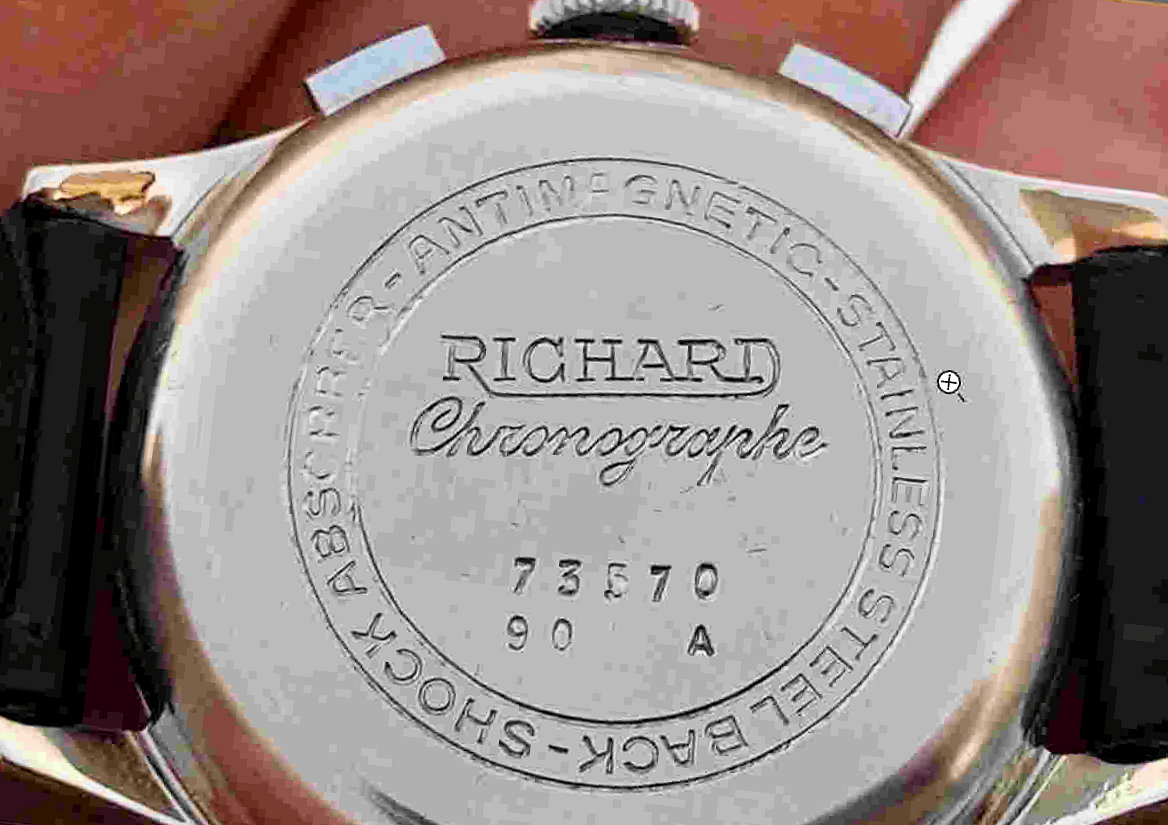 Ein mechanischer Chronograph der Marke Richard SA. Beschriftet: “Richard, 17 Jewels, Incablock”, hinten: ”Antimagnetic, Shock Absorber, Stainless Steel Back, Richard, Chronographe, 73370, 90, A ”, innen: “ ” . Das Werk ist ein Kaliber Valjoux 92.