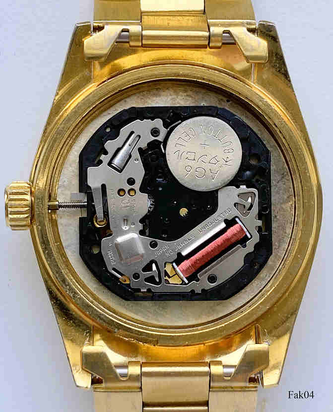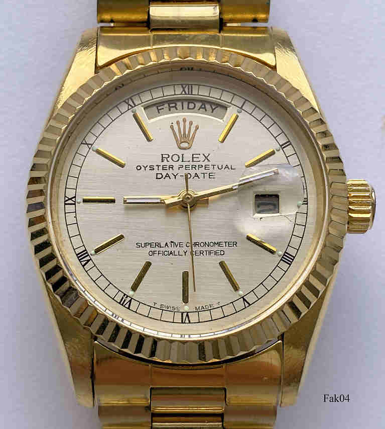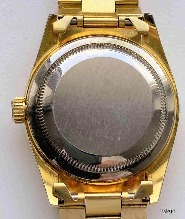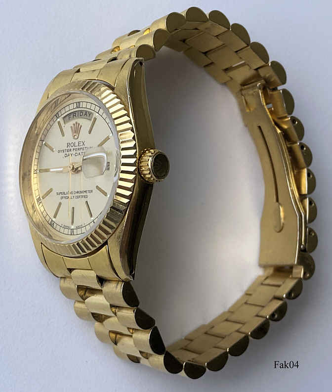 Dies ist ein Rolex Oyster Perpetual Day-Date Nachbau, vermutlich aus China. Ausgerüstet mit einem einfachen Quartzuhrwerk. Beschriftet vorn: ”Rolex, Oyster Perpetual, Day-Date, Superlative Chronometer, Officially Certified, Swiss Made.”, innen: ”Shiojiri, VP44, Japan”, Datum bei der 3 mit Lupe, Wochentag bei der 12. Metall Glieder Armband, Werk Shiojiri VP44