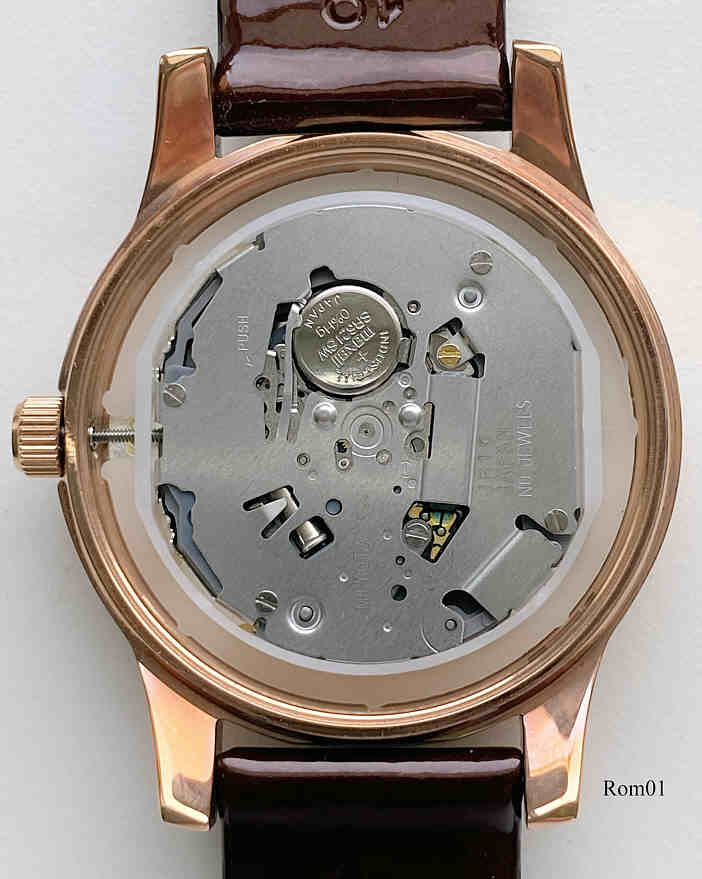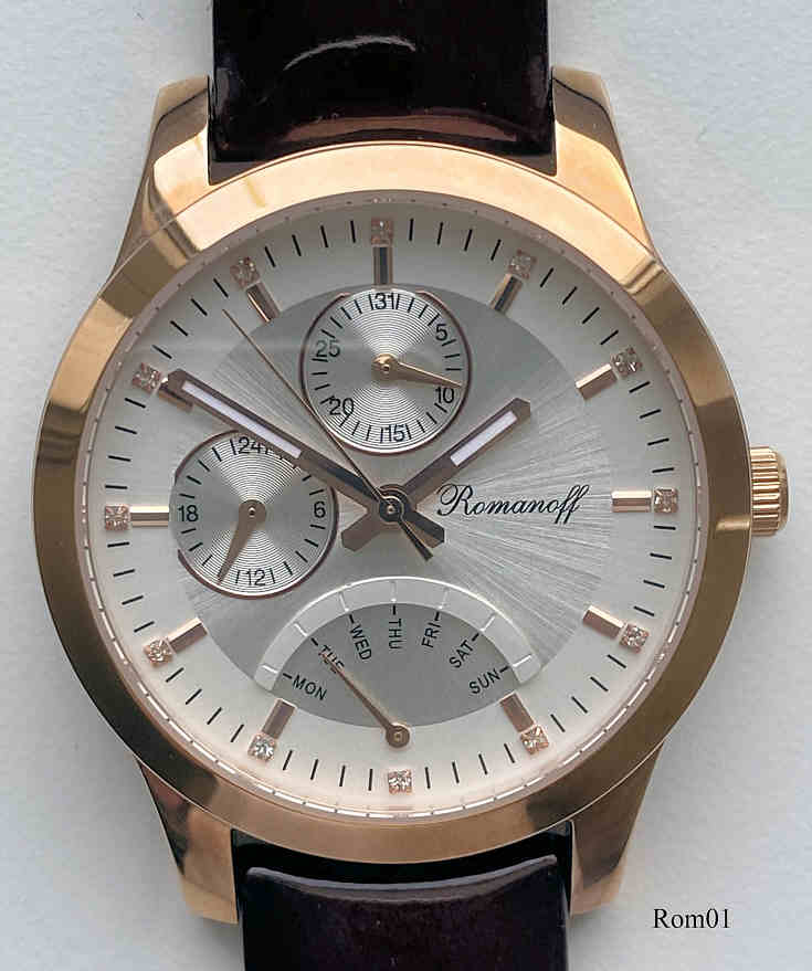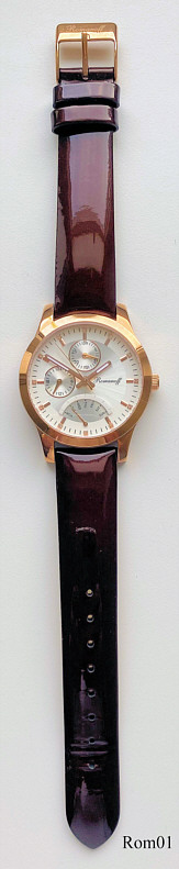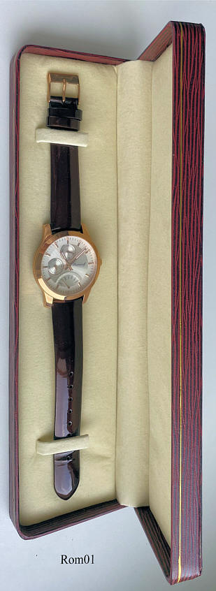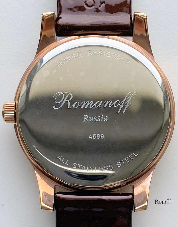Dies ist eine Romanoff Quartz Uhr mit Kalender, Caliber Miyota JR10. Beschriftung vorn: ”Romanoff”, Rückseite: ”Romanoff, Russia, Water Resistant, All Stainless Steel, 4589 ”, innen: “Miyota Co., JR10, Japan, No Jewels”. Der obere Ring zeigt das Datum, der mittlere Ring ist der GMT Zeiger, unten ist der Wochentag. Edelstahl Gehäuse, gedrückter Boden, braunes Lacklederarmband. Diese Uhr habe ich 2011 im Hotel Cosmos in Moskau gekauft.