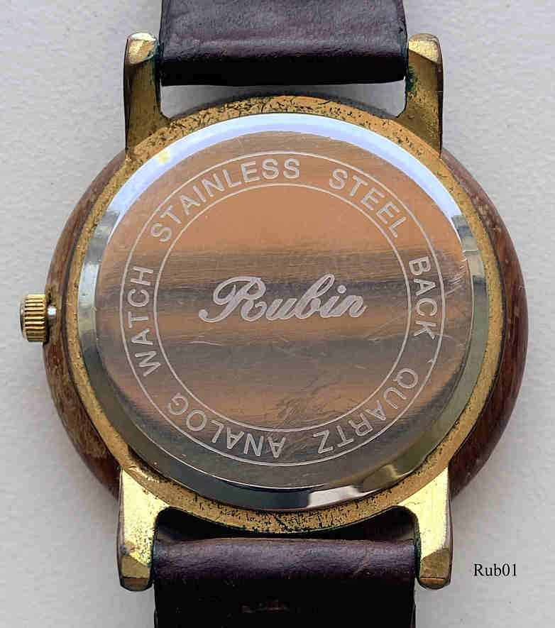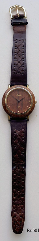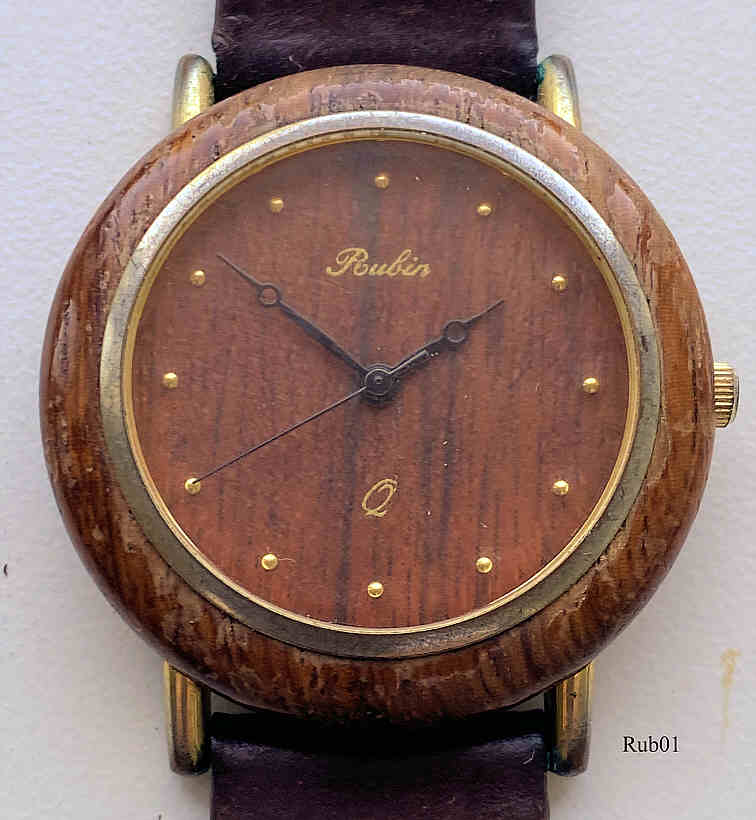 Eine sehr schöne Holzuhr der Marke Rubin mit Quartzwerk. Das Gehäuse ist aus Base Metal, der Holzring ist aufgesetzt.  Beschriftung vorn: “Rubin, Q”, innen: ”Unadjusted, Miyota Co., Japan”, hinten: “Rubin, Stainless Steel Back, Quartz Analog Watch”  . Uhrwerk Miyota. Braunes Lederarmband