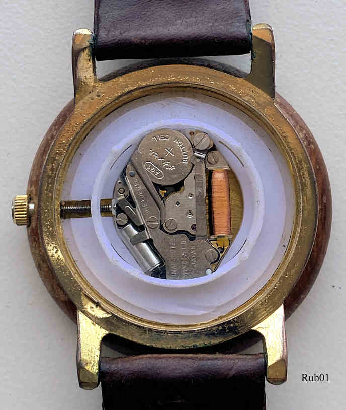 A beautiful woodwatch of Rubin with quartz movement. The case is made of  base metal, the wooden ring is glued on. Signed front: “Rubin, Q”, inside: ”Unadjusted, Miyota Co., Japan”, back: “Rubin, Stainless Steel Back, Quartz Analog Watch”. Movement Miyota. Brown leather band