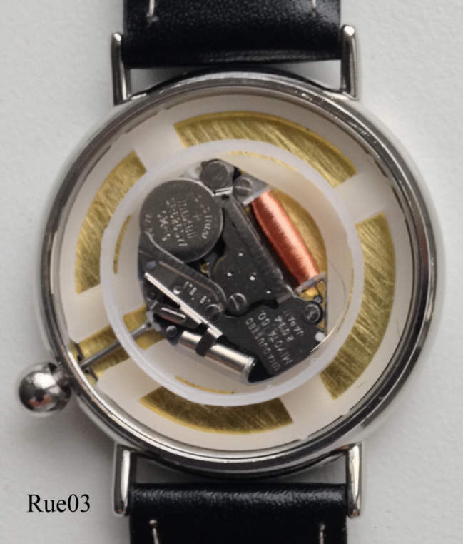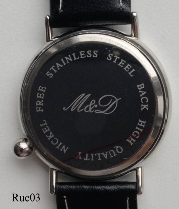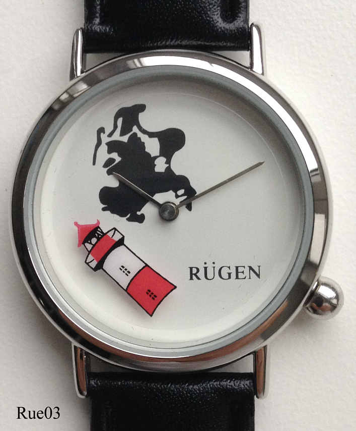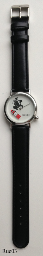 Eine Motivuhr als Andenken an die Insel Rügen. Der Leuchtturm kreist als Sekundenzeiger um das Zifferblatt.. Beschriftet vorn: “Rügen ”, hinten:”Nickel free, Stainless Steel back, High Quality, M&D”, innen: “Unadjusted, Miyota Co., 2014, Japan”, Schwarzes Lederarmband, gekauft 2014 bei unserer Rügen Tour.