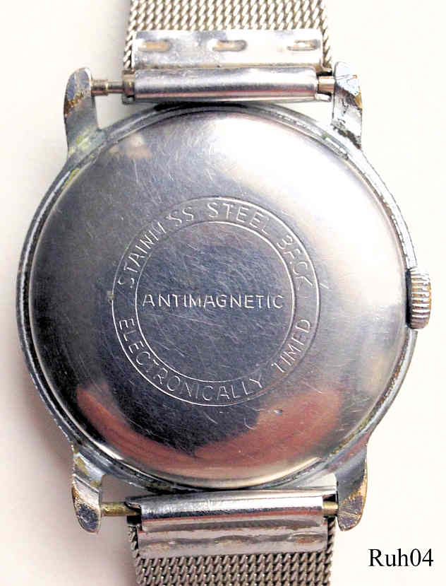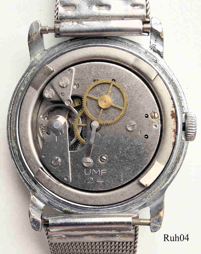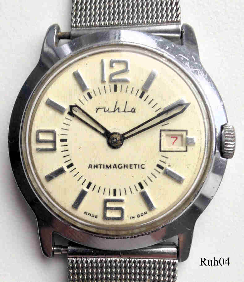 Eine Ruhla Handaufzugs Uhr mit Base Metal Gehäuse und Stainless Steel Back, eine Uhr aus der Ruhla UMF Manufaktur. Datum bei der 3, Beschriftung vorn: “Ruhla, Antimagnetic, Made in GDR”, hinten: “Antimagnetic, Stainless Steel Back, Electronically Timed”, innen: “UMF 24”. Edelstahl Milanaise Band.