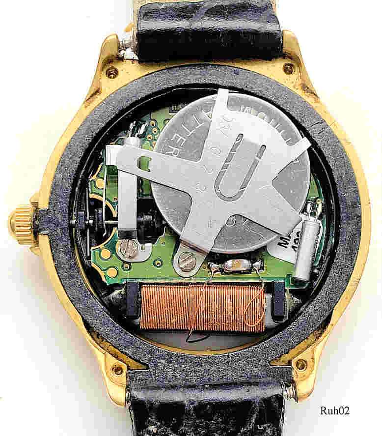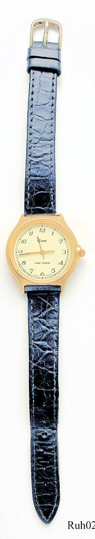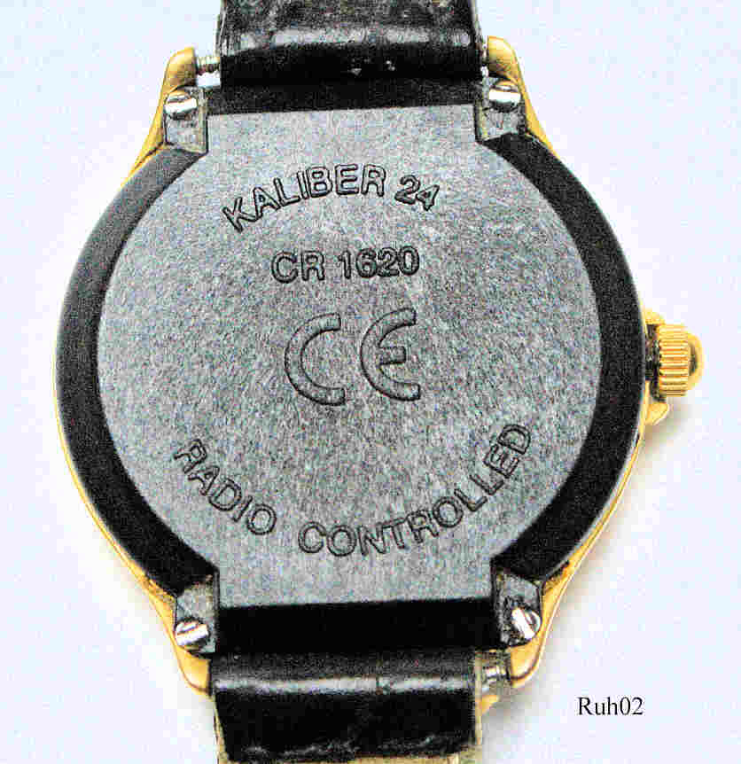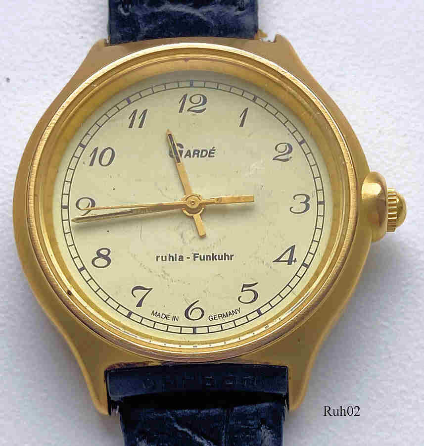 Dies ist eine Damen Funkuhr von Ruhla mit schönen Ziffern auf dem cremefarbenen Zifferblatt. Die Uhr synchronisiert sich mit dem DCF77 Sender und stellt alle relevanten Daten nach. Das Uhrwerk ist ein Quartzwerk von Ronda, die Empfängerplatine wurde in Ruhla entwickelt und gebaut. Beschriftet vorn: ” Gardè, Ruhla - Funkuhr”, hinten: ”Kaliber 24, Radio Controlled, CR1620, CE”, innen: ”HK1051A, 03/023”