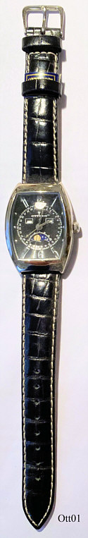 A nice quartz watch of Ottimo from Canada with Miyota Movement. Signed front: “Ottimo”, back: “Ottimo, Nickel Free, Water Resistant, Stainless Steel Back”, inside: “Unadjusted, 6P80, Miyota Co“. Black Dial with two windows for month and day, the date is displayed by a hand. At 6 is the window for the moonphase. Black leather band, Miyota movement 6P80.