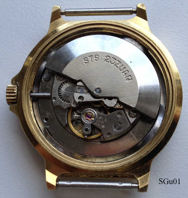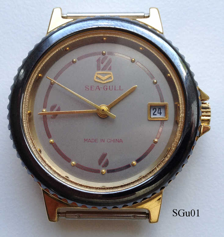 Eine Sea Gull Automatic Uhr aus dem größten Chinesischen Uhrenwerk Tianjin, Datum bei der 3, 23 Steine. Beschriftet vorn: “Sea Gull, Made in China”, hinten: “Sea Gull ” und Logo, innen: “ST6, 23 Zuan”. Goldfarbenes Gehäuse aus Base Metal, verschraubter Edelstahl Boden, Kaliber ST6.