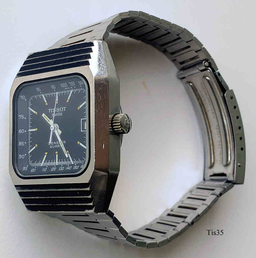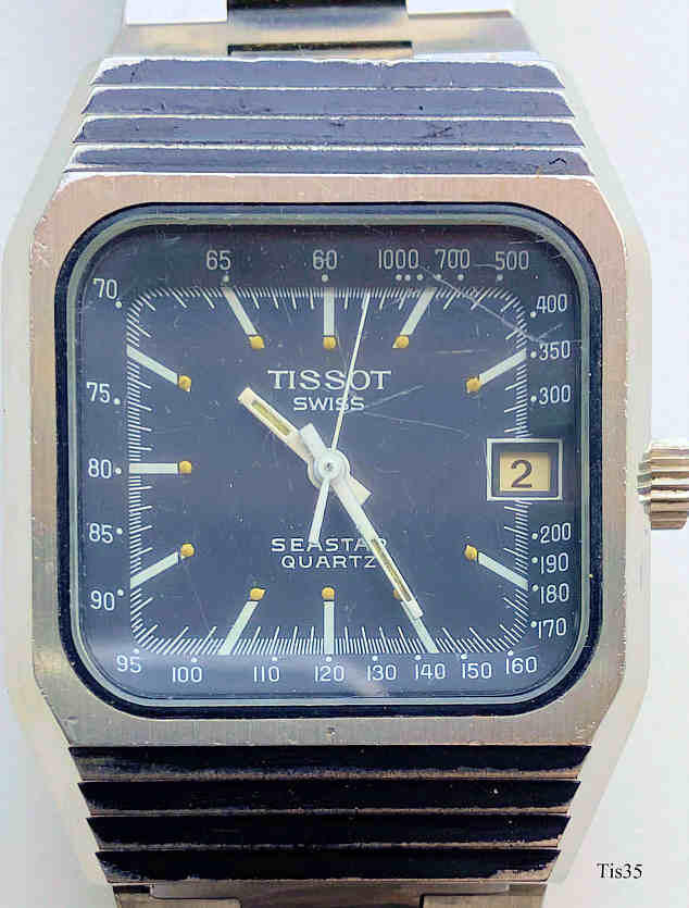 Eine Tissot Seastar Quartz Uhr mit Edelstahl Gehäuse und Edelstahl Back, Datum bei der 3, Beschriftet vorn: ”Tissot, Seastar, Quartz, Made in Swiss”€, innen: ”Tissot, 20864, 2030, Swiss”, Edelstahlarmband. Kaliber Tissot (SSiH) 2030.