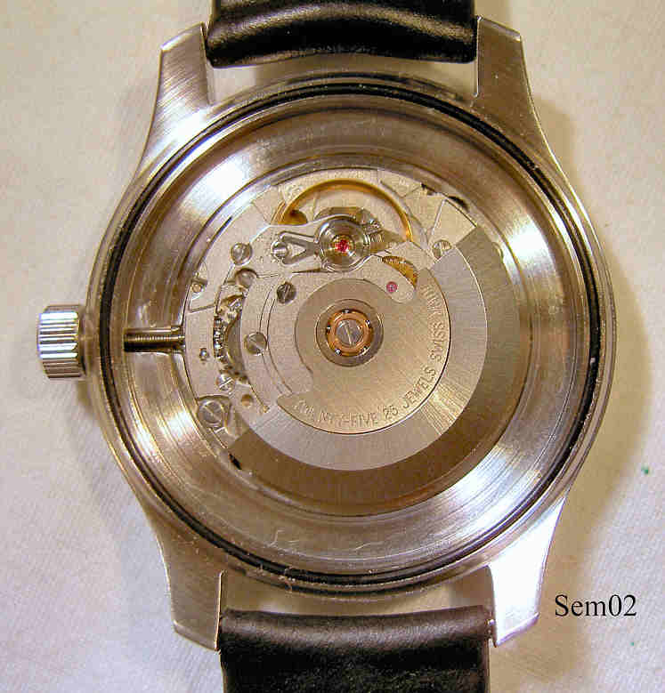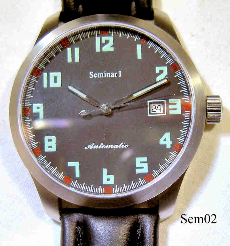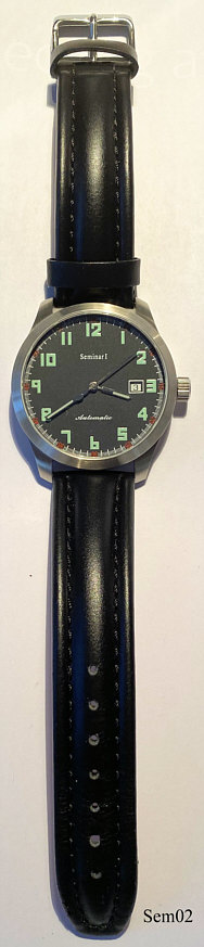 Eine Automatik Fliegeruhr, wie sie im Uhren Basis Seminar bei Martin Braun als Übungsobjekt verwendet wird. Diese Uhr habe ich selbst zerlegt, wieder zusammen gebaut und auf der Zeitwaage einreguliert. Es handelt sich um ein ETA Automatik Werk, Kaliber ETA 2824, mit verschraubter Krone. Stahlgehäuse mit schwarzem Lederarmband. Beschriftung vorn: ”Seminar 1, Automatic”, innen: ”Twenty-five 25 Jewels, Swiss Made”.