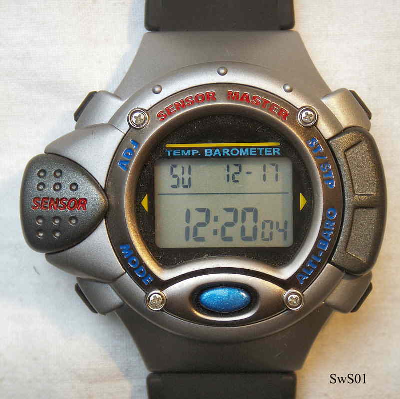 An LCD watch of the brand Swiss Sensor with the special function temparature and pressure meter. With that one can show temparature, barometric pressure and hight. Signed front: ”Sensor Master”, back: ”Swiss Sensor, Sensor Master, 30M Water Resistant, Stainless Steel Caseback”. Funktions: Date, Time, Temparature, Barometer, Altimeter.Plastic case with rubber band. |