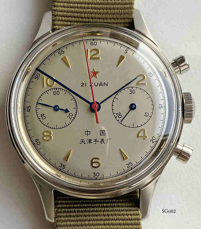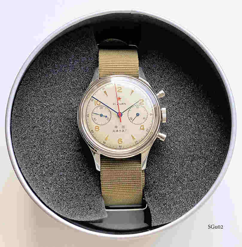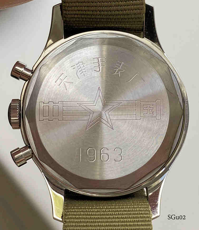 Ein Sea Gull Chronograph für die chinesische Luftwaffe. Das Original wurde 1963 gebaut, dies ist ein Nachbau von Seagull. Es handelt sich um einen Schaltrad Chronographen auf der Basis des Venus 175 Werkes. Beschriftet vorn: “Logo, 21 Steine”, hinten: “1963” und Logo, innen: “ ”. Gehäuse aus Base Metal, verschraubter Edelstahl Boden, Kaliber ST19.