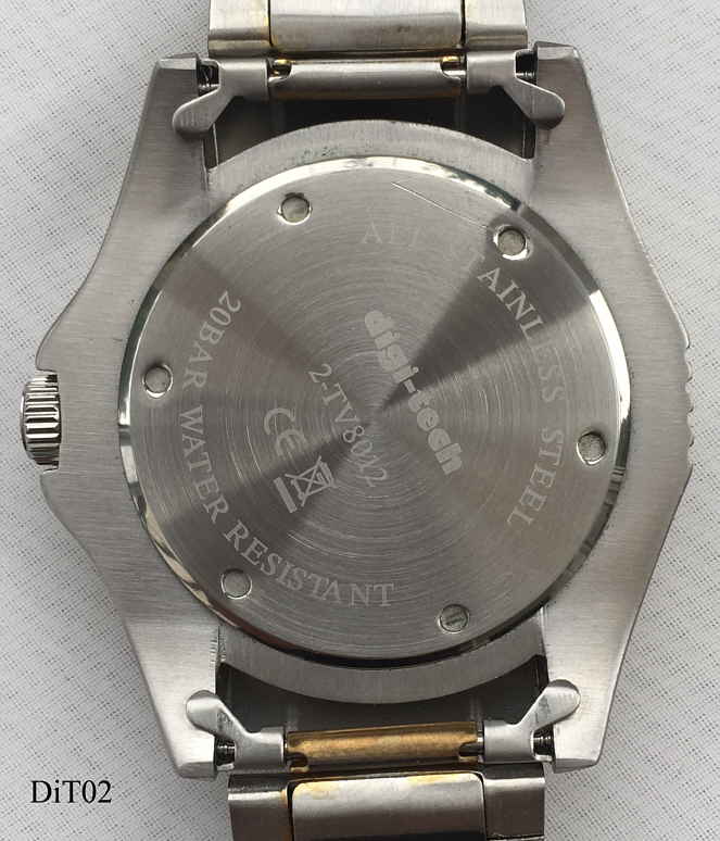A DigiTech Shark quartz divers watch in stainless steel case, blue dial with large luminous numbers, blue rotating chapter ring. Signed front: “Shark,20 ATM”, Inside:”SIIO, PC32A, No Jewels, Unadjusted, Japan”, back: ”All Stainless Steel, 20 Bar Water Resistant, DigiTech, 2-TV8012”, Caliber SIIO PV32A. Date at 3. Stainless Steel band, screw-on crown.