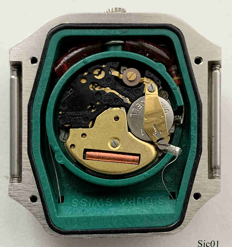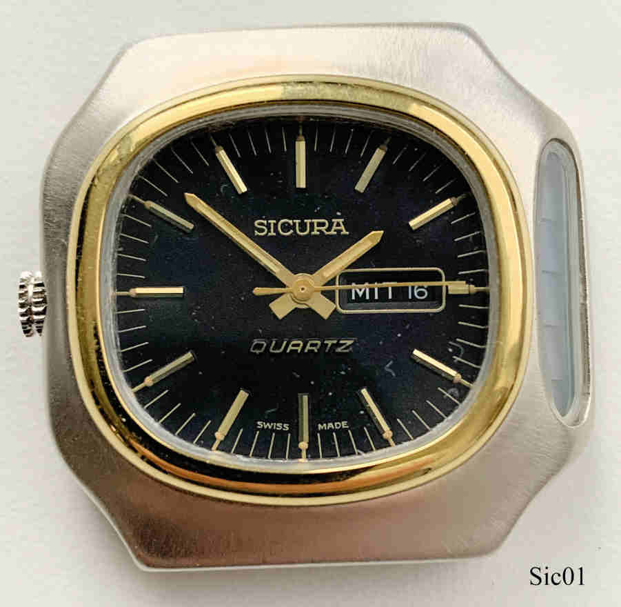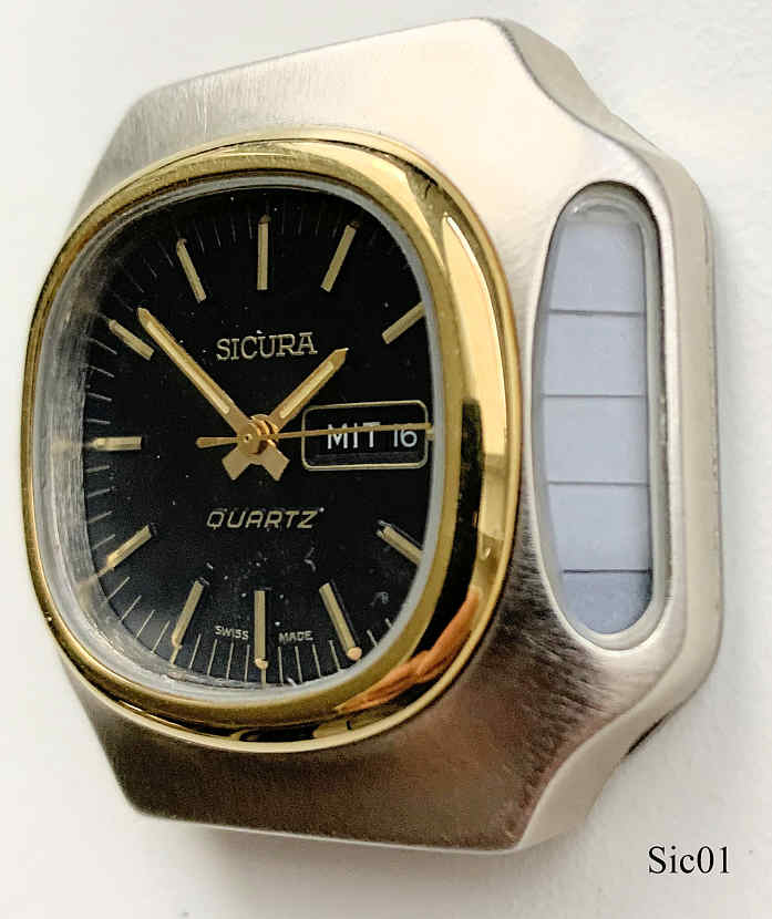 A very early solar watch of Sicura with base metal case and stainless steel back. Black dial with day/date at 3. Signed front: ”Sicura, Quartz, Swiss Made”, back: ”Stainless Steel Back, Swiss Made I1”, inside: “Seven 7 Jewels, Unadjusted, Swiss”. The crown is on the left side, on the right side the Solarpanel is mounted at the side. |