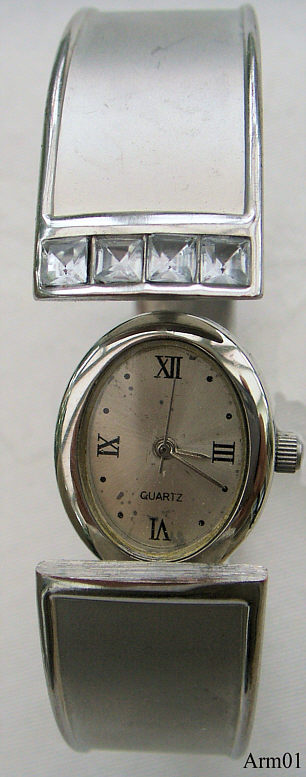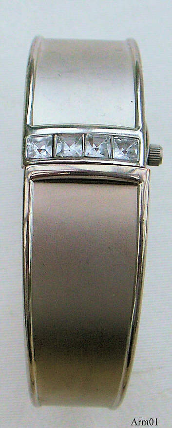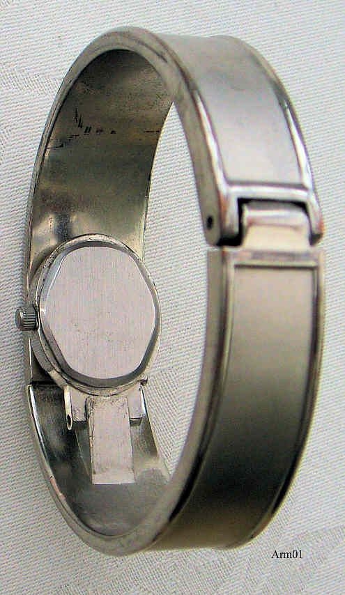Dies ist eine Schmuckuhr in Form eines Armreifes. Normal ist die Uhr nicht sichtbar, zum Ablesen der Zeit muß man den Armreif etwas aufklappen, dann erscheint die Uhr. Beschriftet vorn: ”Quartz”, hinten: ””, innen: “No (0) Jewels, Swiss Parts, Movement China, Prestige Time LTD, ISA K63” Angetrieben von einem ISA K63 Werk. Keine Markenangabe. |