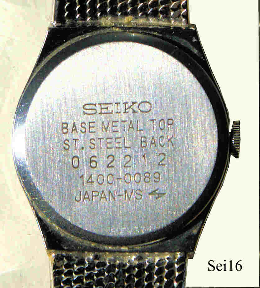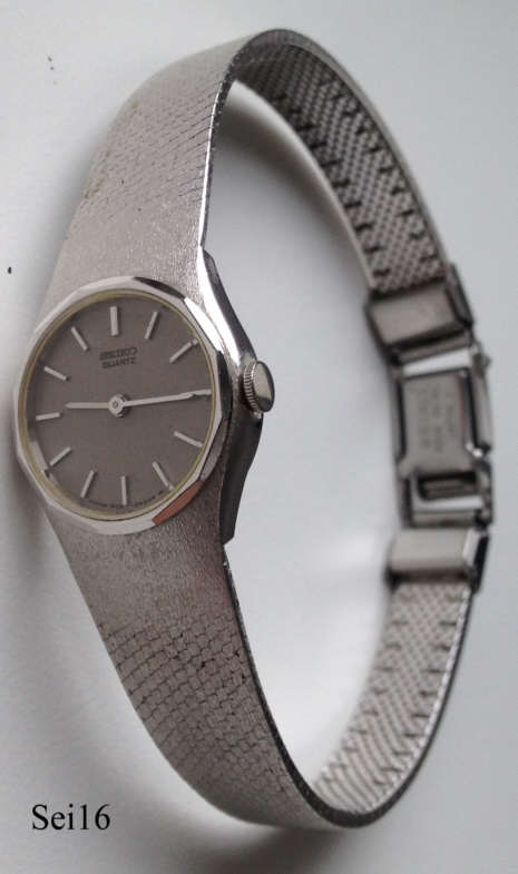 Dies ist eine silberne Seiko Damenuhr mit silbernem Zifferblatt, die Striche sind nur aufgesetzte Balken, Zeiger ebenfalls silber. Beschriftung vorn: ”Seiko, Quartz, Japan 1400- 0420 R”, hinten: “ Seiko, Base Metal Top, St. Steeel Back, 062212, 1400-0089, Japan-MS”, innen: “5J, Seiko, 14A, Japan”. Mit geklemmtem Stahlboden und integriertem silbernem Milanaisearmband.