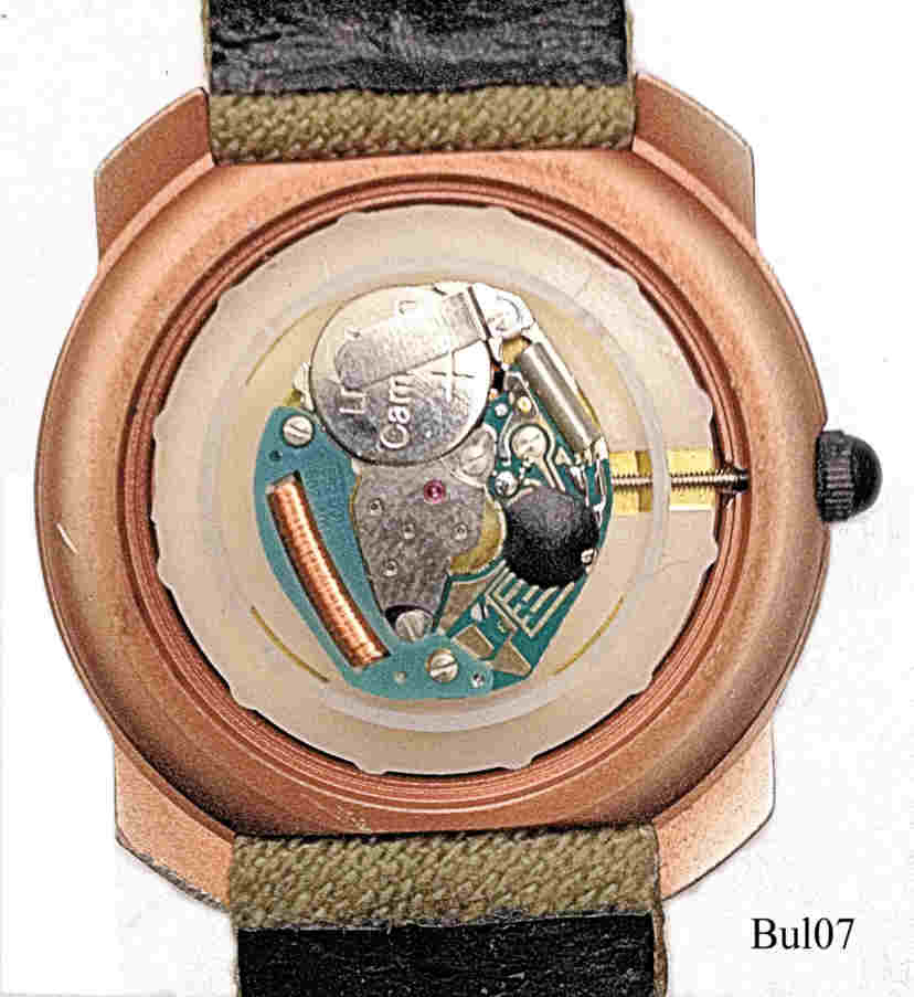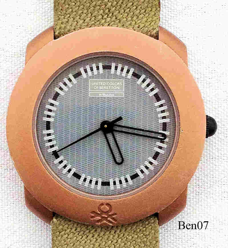 Benetton by Bulova in rose color, movmt. ETA 562.001 or 562.101, signed front: ”United colors of Benetton, by Bulova”, back: ”United Colors of Benetton, by Bulova, Stainless Steel Back, Water Resistant, Base Metal Bezel, Mod. Dep.”, Grey Sisal strap with Benetton clasp.