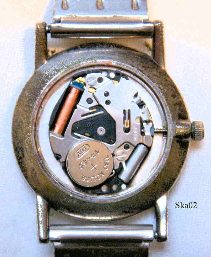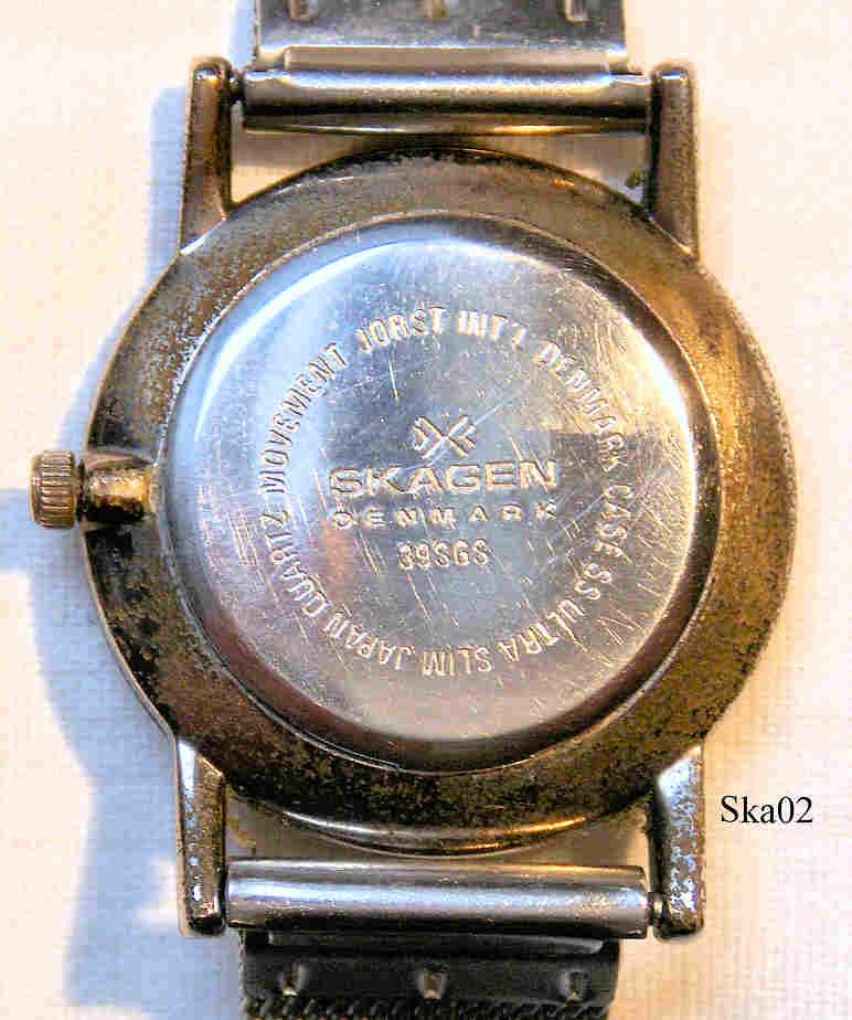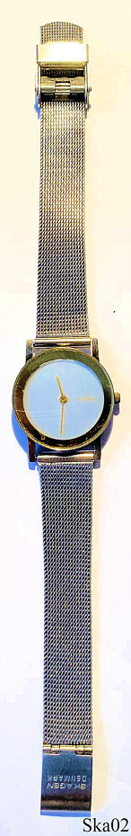 A Skagen ladies design watch with base metal case, signed front: “Skagen, Denmark”, back: “Jorst Intl. Denmark, Case SS Water resistant 100 Ft, Ultra slim, Japan Quartz Movement, Skagen, Denmark, 39SGS”, inside: “Morioka Tokai, VX50E, 1, Japan, No Jewels”. Stainless Steel mesch band.