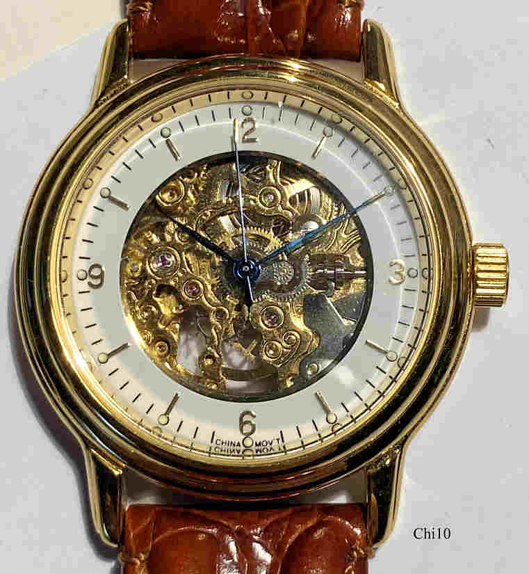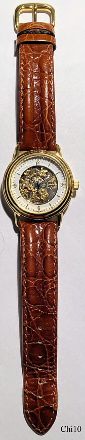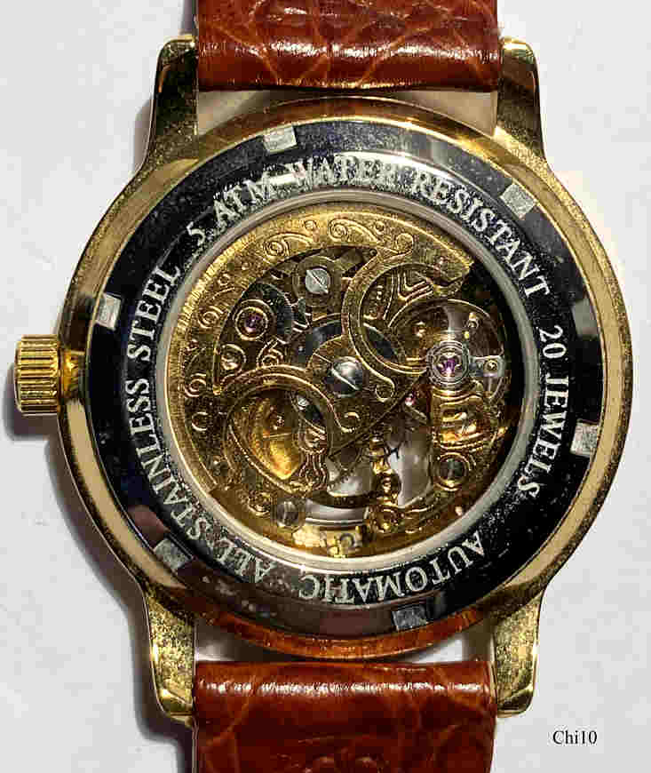 Eine sehr schön gearbeitete Skelett Automatik Uhr, hergestellt in China. Rückseite mit Glaseinsatz, so kann man sehr schön die Bewegung des fein zieselierten Schwungrades sehen. Beschriftet: ”Automatic, All Stainless Steel, 5 ATM Water Resistant, 20 Jewels.” Auf dem Zifferblatt: ” China Made”