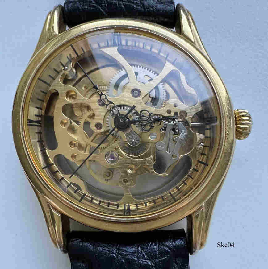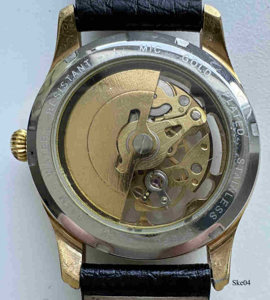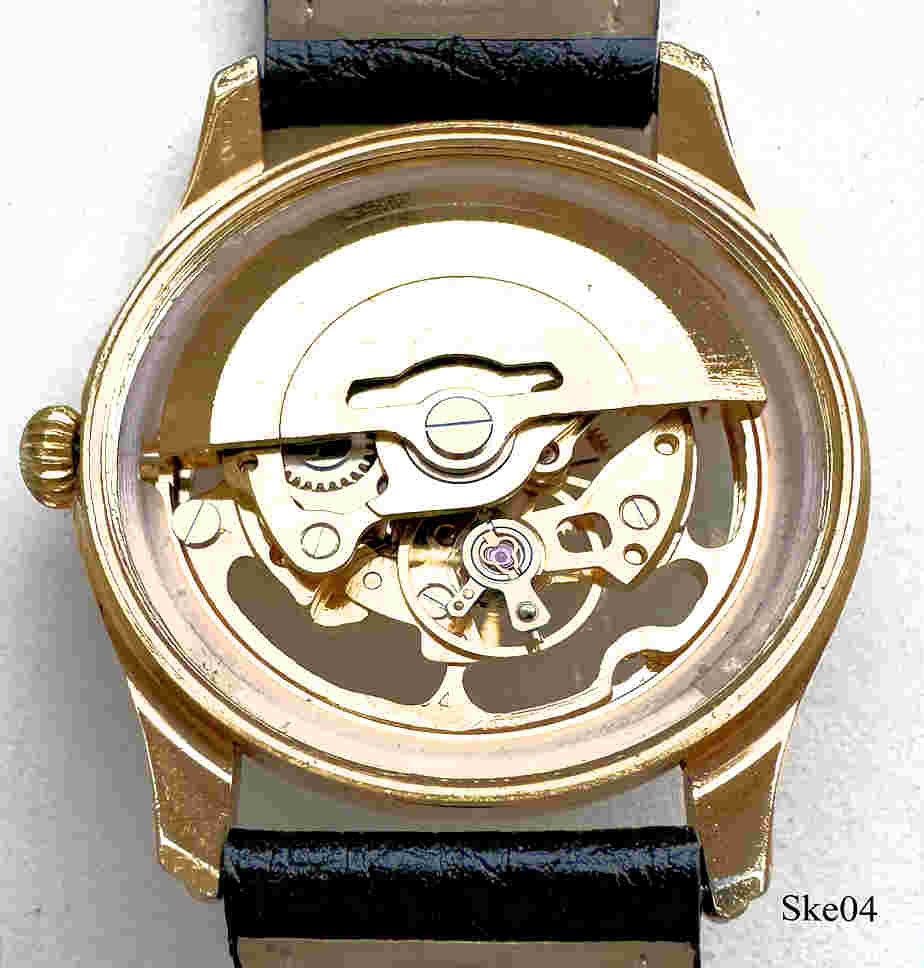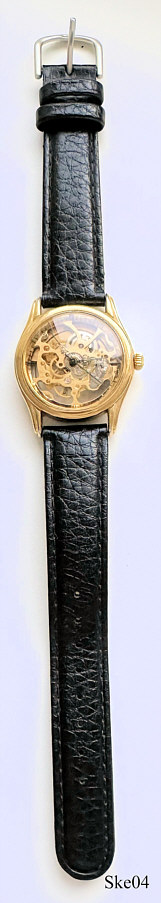A skeleton automatic watch, no brand information, expected russion origin. Base Metal Case 1 mic. gold plated, with glas bottom and black leather band. Signed back: “3 ATM Water Resistant, 1 Mic. Gold Plated, Stainless Steel Back”.