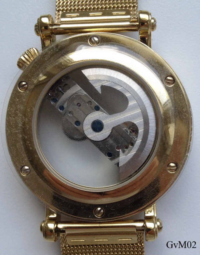 Diese Schmuck- Automaticuhr Graf von Monte Wehro ist eine interessante Konstruktion. Das Uhrwerk ist in dem mittleren “Stab” aufgebaut und von beiden Seiten voll sichtbar. Ansonsten ein normales Automatic Werk Beschriftung vorn: Römische Ziffern auf dem Gehäuserand, seitlich: ”Graf von Monte Wehro”, eine Kaliberangabe ist nicht zu sehen. Das gleiche Kaliber wird in der Eyki verwendet