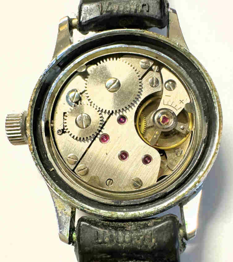 Dies ist eine Bifora Handaufzugs Uhr mit dem Bifora 91/1 Werk, Zentralsekunde, Beschriftet vorn: ”BIFORA, 17 Jewels”, hinten: ”Skin Diver, Shock Protected., Antimagnetic, 100% Waterproof Tested, 10 Atmospheres”, innen: “B, 91/1”. Kaliber: Bifora 91/1 , schwarzes Lederband.