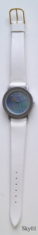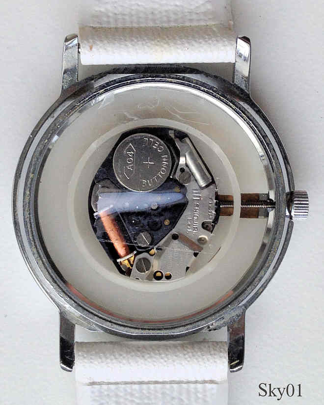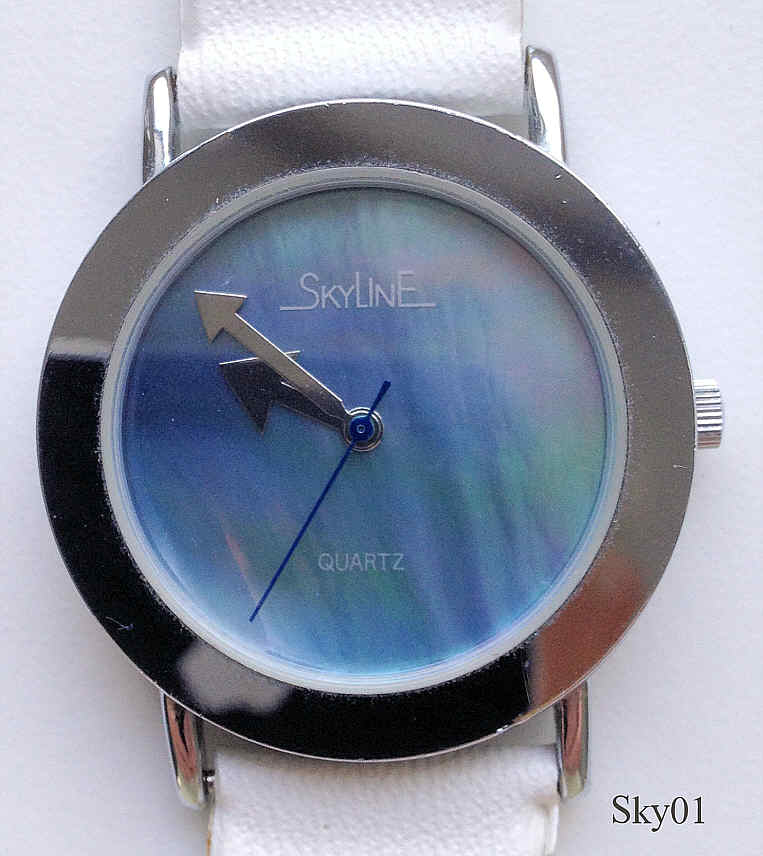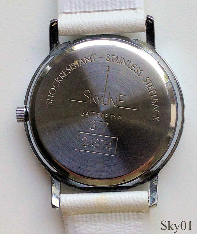 Eine schlichte, sehr schöne Skyline Damen Quartz Uhr mit Base Metal Gehäuse und Stainless Steel Back. Das Zifferblatt ist aus schön schillerndem Perlmutt. Beschriftung vorn: ”Skyline, Quartz”, hinten: ”Shock Resistant, Stainless Steel Back, Skyline, Battery Typ, 377, 24874”, innen: “Shiojiri, Y121A, No Jewels”. Weißes Kunststoffband.