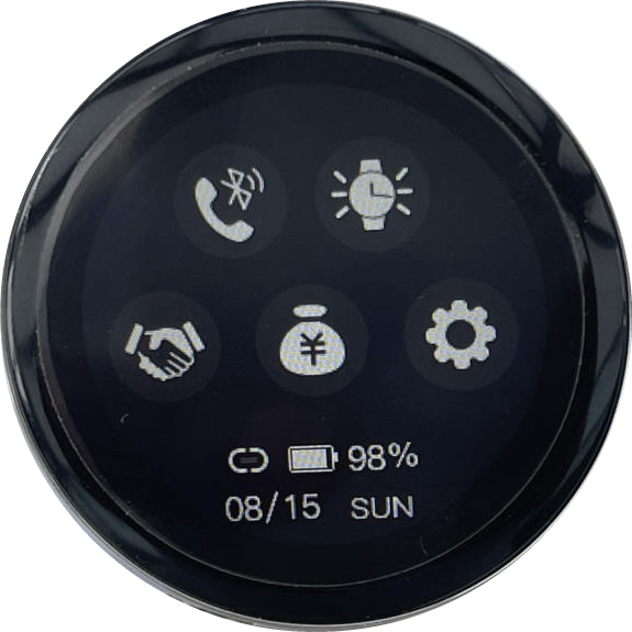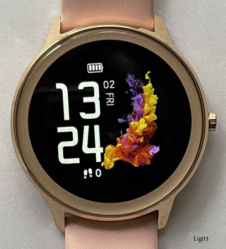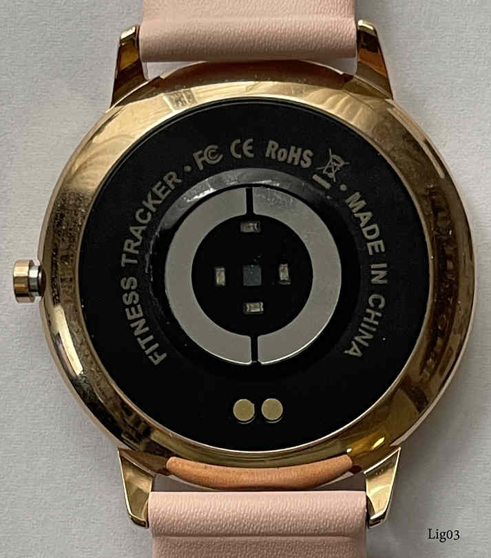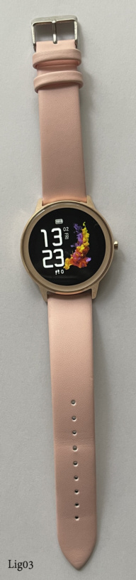 Eine Lige Damen Smartwatch, Modell Fitness Tracker. Das Gehäuse ist aus Metall. Beschriftung vorn: ” ”, hinten: ”Fitness Tracker, FC, RoHS, Made in China”. Verbindet per BlueTooth mit Android und IOS. Funktionen siehe mittleres Bild. Rosè Kunststoffarmband.