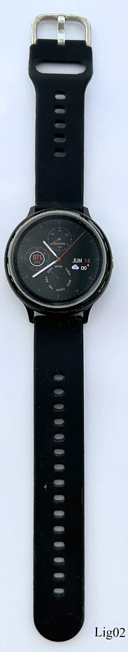 A Lige mens smart watch, model L11. The case is made of hardplastic. Signed front:” ”, hinten: ”RoHS, 44mm, BLEL 0W Power Consumption, Smart Watch TFT Display, Heart Rate, IP67 CE Made in China”. Connects via bluetooth with Android and IOS, functions see middle picture. Black plastic sports band.