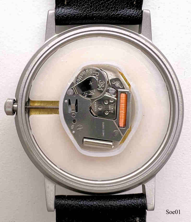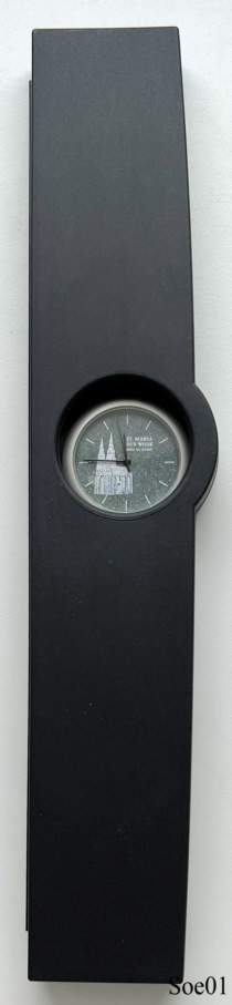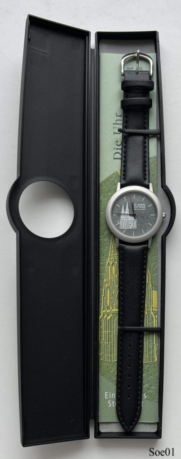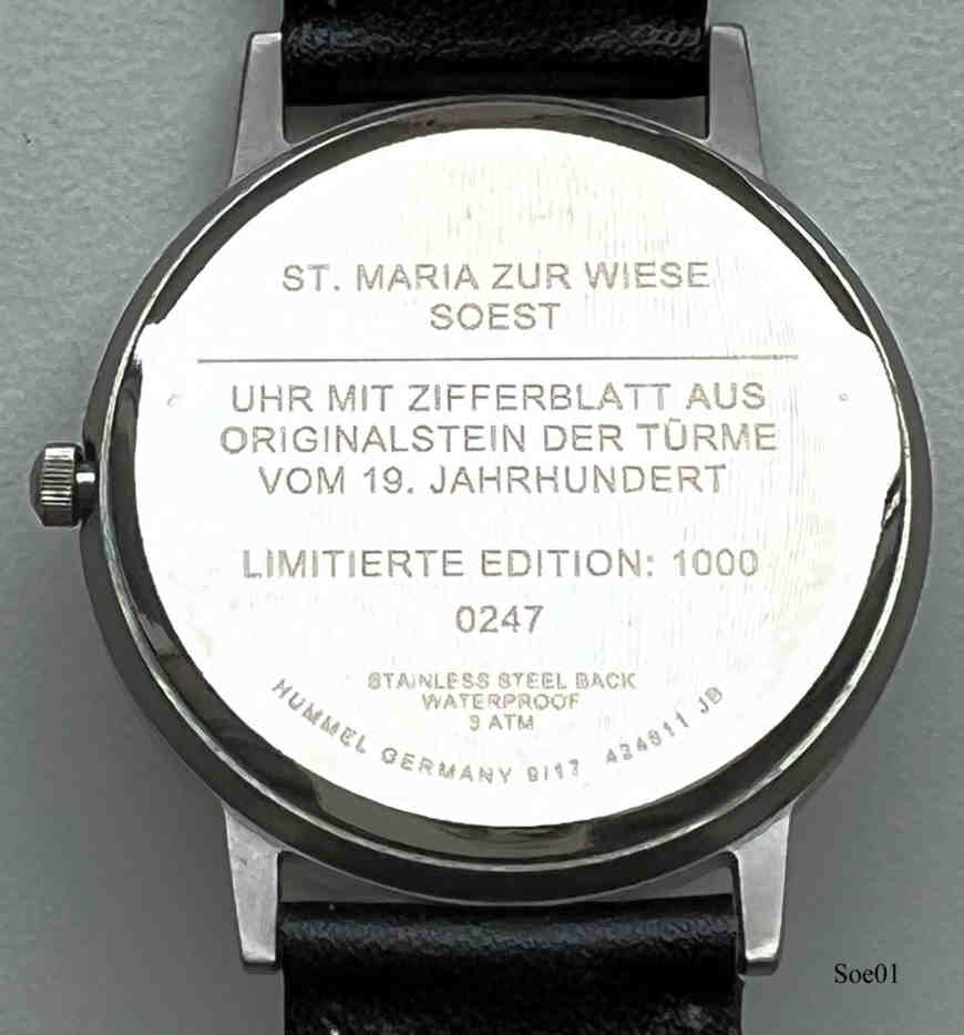 Eine Spendenuhr für die Restaurierung des Soester Doms. Das Zifferblatt besteht aus dem grünen Sandstein der Türme aus dem 19. Jahrhundert. Beschriftet vorn: “St. Maria,zur Wiese, Dom zu Soest”, hinten:”St. Maria zur Wiese, Soest,Uhr mit Zifferblatt aus, Originalstein der Türme, vom 19.Jahrhundert, Limitierte Edition: 1000, 0247, Stainless Steel Back, Waterproof, 3 ATM, Hummel Germany 9/17, 424811 JB ”, innen: “Ronda, 1 one Jewel”, Schwarzes Lederarmband, gekauft 2022 in Soest.