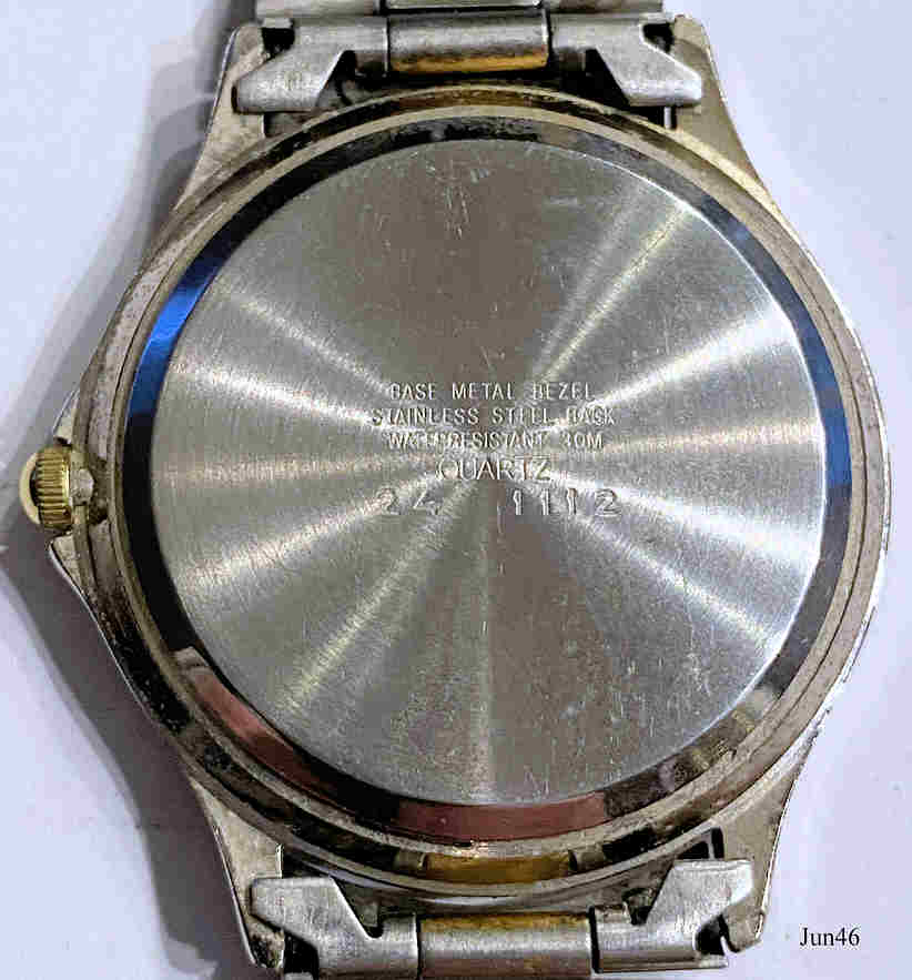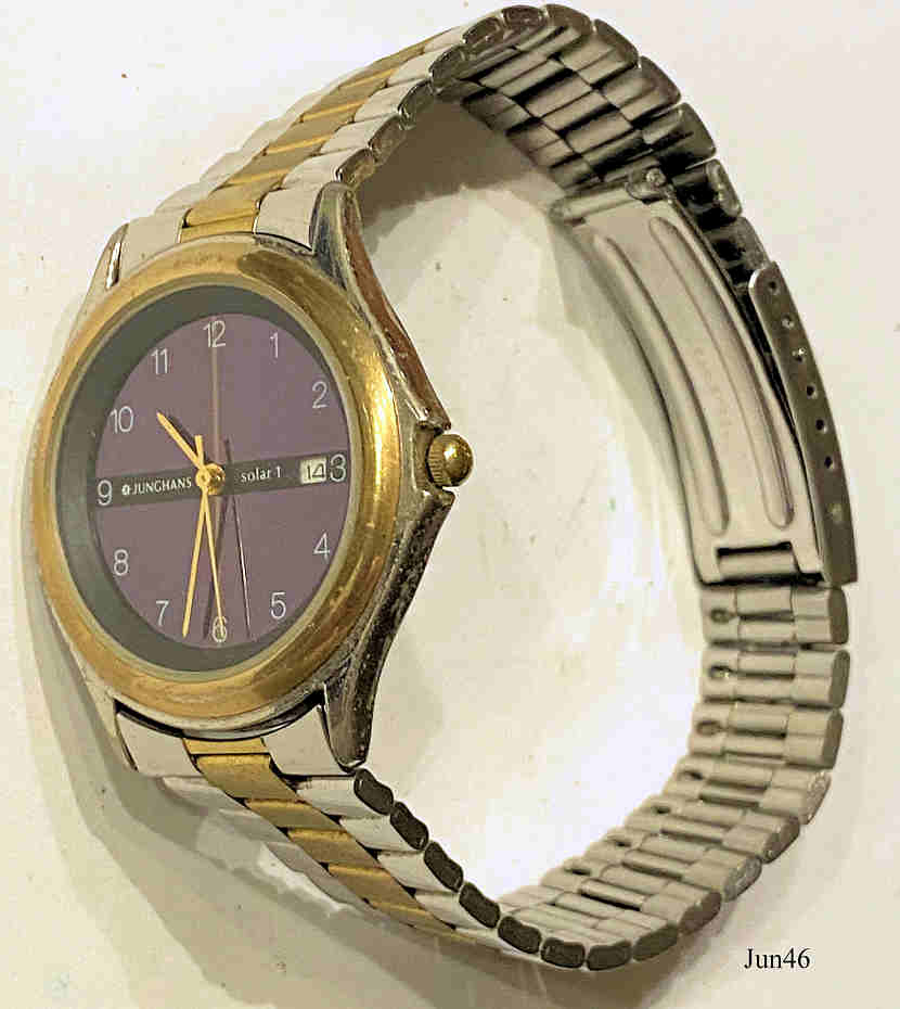 Eine Junghans Solar Damen Armbanduhr mit Kalender bei der drei. Das Zifferblatt ist eine große Solarzelle, die bei Sonnen Einstrahlung Strom erzeugt und in einem Kondensator GC920 speichert. Dieser Kondensator treibt dann eine normale Quartz Uhr an. Inschrift vorn: ”Junghans Solar 1”, hinten: ”Base Metal Bezel, Stainless Steel Back, Water Resistant 30m, QUARTZ, 24-1112”, innen: “Japan, V122A, Shiojiri Ltd., Unadjusted, One 1 Jewel”. Bicolor Metallarmband