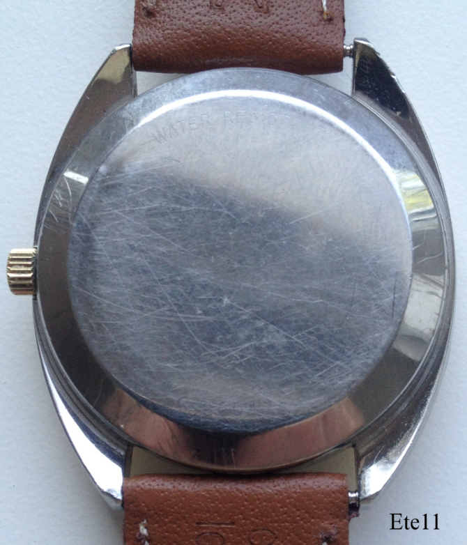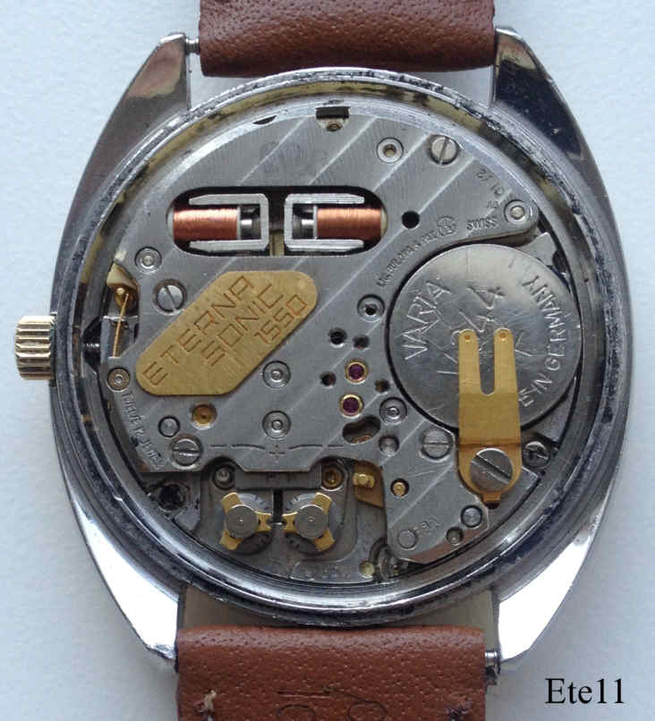 Dies ist eine Eterna Sonic mit vergoldetem Gehäuse, Datum bei der 3. Das Werk ist ein Eterna 1550 (ETA 9162 ), beschriftet vorn: ”ETERNA, Sonic, Electronic”, hinten: ”Water Resistant, 55900176”, innen: ”ETERNA, Sonic, 1550, Unadjusted, 12 Jewels”, Gehäuse 349T.