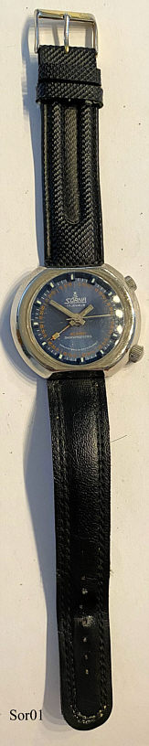 This Sorna alarm watch has been sold in different models, one example is a parking meter version. 17 Jewels, the upper crown is used for the normal watch functions like winding and moving the hands, the lower crown adjusts the alarm time and winds the alarm spring. The red hand shows the alarm time. Signed front: “Sorna, 17 Jewels, Alarm, Shockprotected, manufactured in Switzerland”, back: “Shockprotected, Swiss made, Waterprotected, Steel Back, Manufactured in Switzerland, 2590”, inside: “Caliber 1217, 1 Jewel (!!), Swiss, Basis Watch, Unadjusted” Black Leather band.