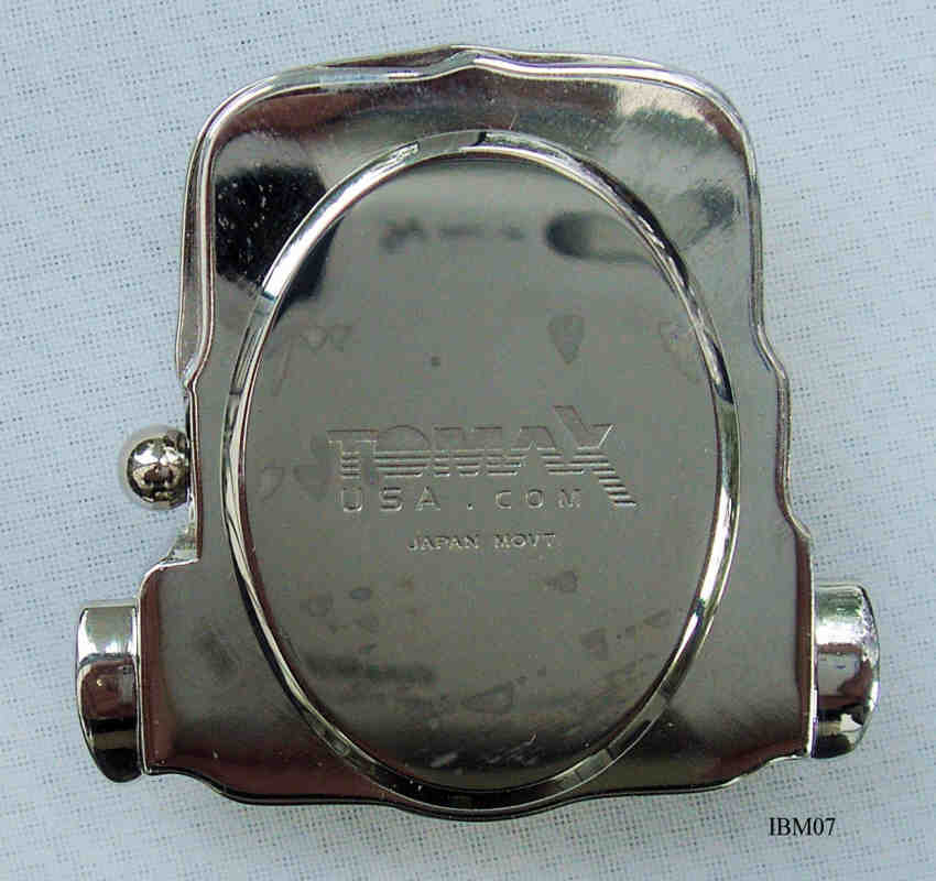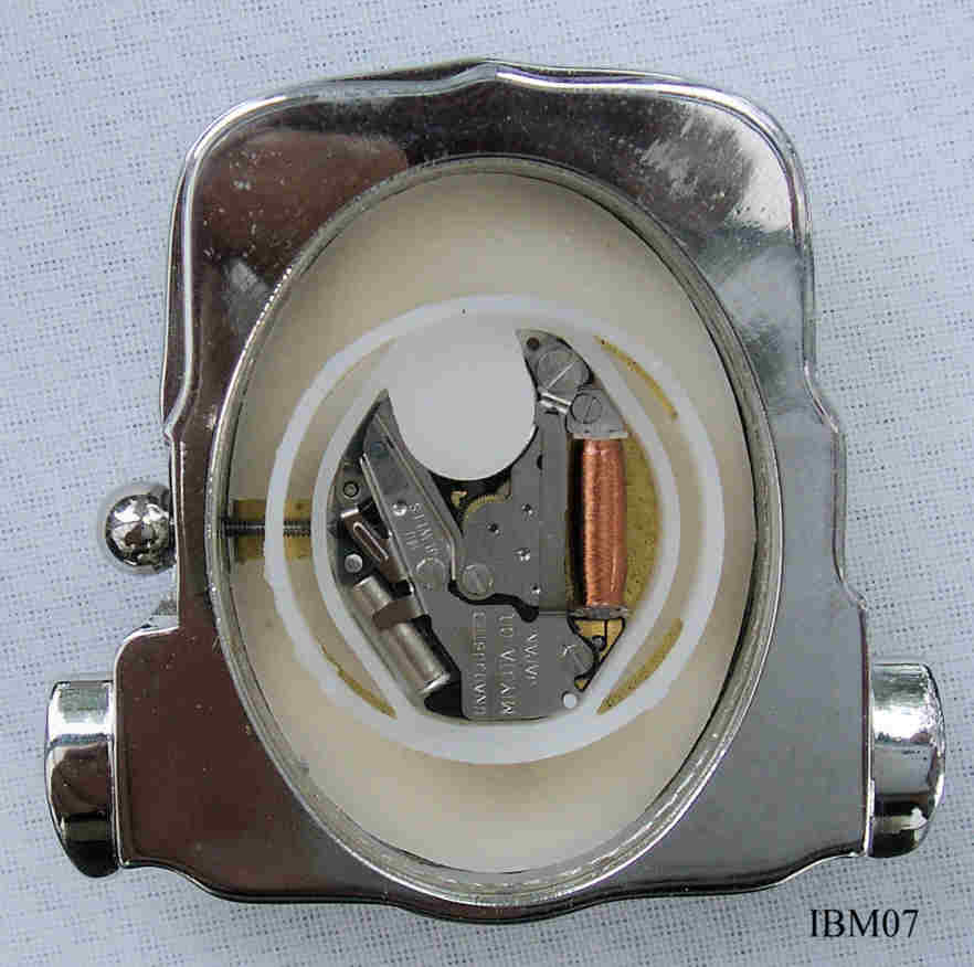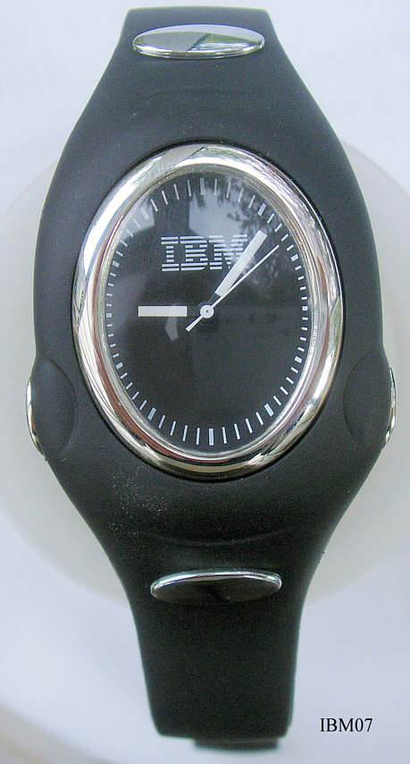 Eine Sportuhr aus der Kollektion der Firma IBM. Es ist ein besonderes Design: Die Uhr ist in einem Metallblock, der wiederum in ein Plastik Cover mit Armband eingedrückt wird. Bezeichnet vorn: “IBM”, hinten: ”TOMAX, USA.com, Japan Mov’t”, innen: “No Jewels, Unadjusted, 280-39, Miyota Co., Japan”. Uhrwerk Miyota 280-39.