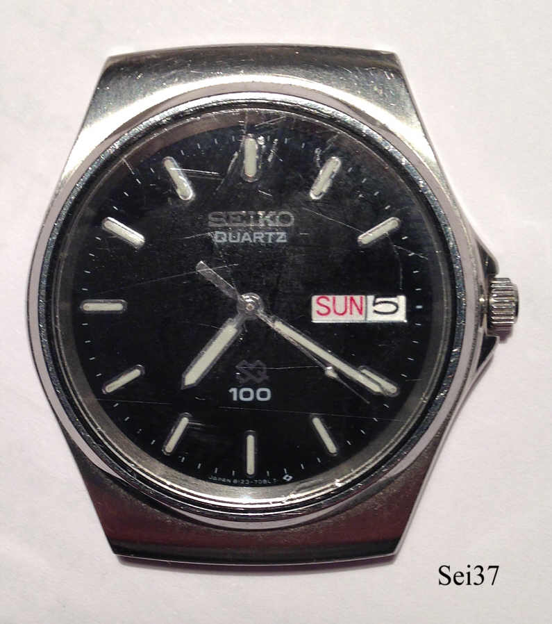Dies ist eine Edelstahl Herrenuhr mit schwarzem Zifferblatt, Day/Date bei der 3. Beschriftung vorn: “ Seiko, Quartz, SQ, 100”, innen: “8123A, Seiko, 5 Jewels, Japan”€¯, hinten: “€¯Seiko, Water Resist 10 ATM, 3D0144, Japan A, Stainless Steel, 8123-7050 A4”€¯ mit geschraubtem Stahlboden.