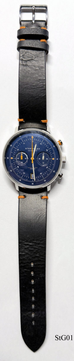 Ein Quartzchronograph im Nostalgie Look der Firma Sternglas. Dies ist eine relativ neue Designfirma in Hamburg. Edelstahl Gehäuse mit zwei ”Augen”, wie bei den früheren mechanischen Chronographen, Datum bei der 6. Schwarzes Lederarmband mit orangenen Applikationen. Beschriftung vorn: “Sternglas, Zeitmesser, Mecha-Quartz, Chrono”, hinten: ”Sternglas, Gestaltet in Hamburg, 5 ATM Wasserdicht, 72.01.2407.0243”. innen: “ VK64A, No Jewels, Japan, 3”.