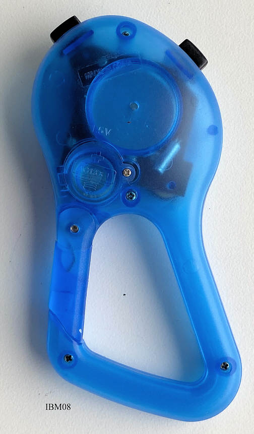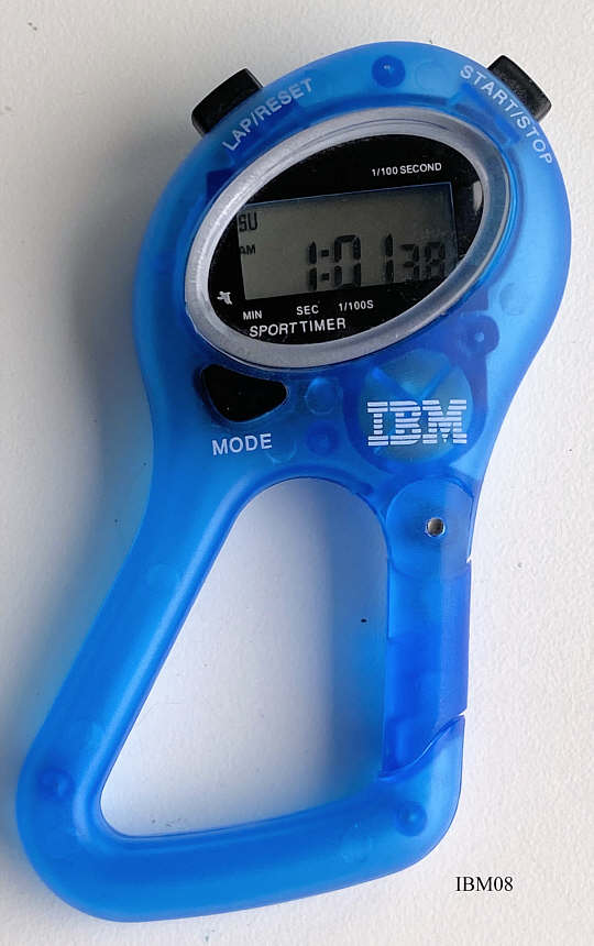 Eine Werbeuhr aus der Kollektion der Firma IBM in USA. Beschriftet vorn: “Lap / Reset, Start / Stop, Mode, IBM, Sporttimer”, Blaues Kunststoff Gehäuse mit integrierter Karabinerklammer