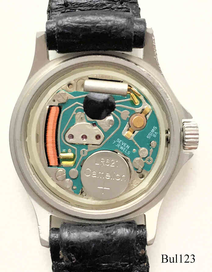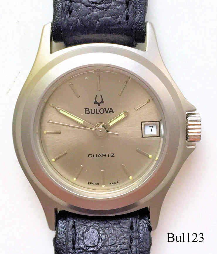 Bulova Ladies Quartz watch with silver grey dial, signed front: “Bulova, Quartz”, back: “BULOVA, All Stainless Steel, Water Resistant 3 ATM,4325 ” inside: ”Seven 7 Jewels, Swiss ”, Movement ETA 956.114. Black Leather band.