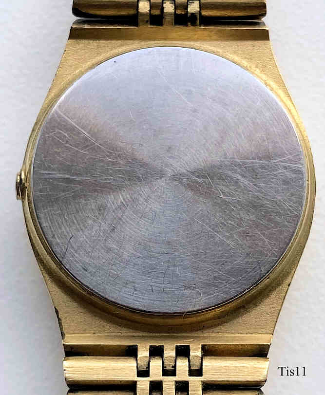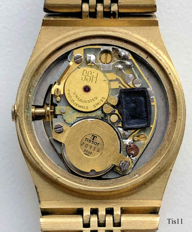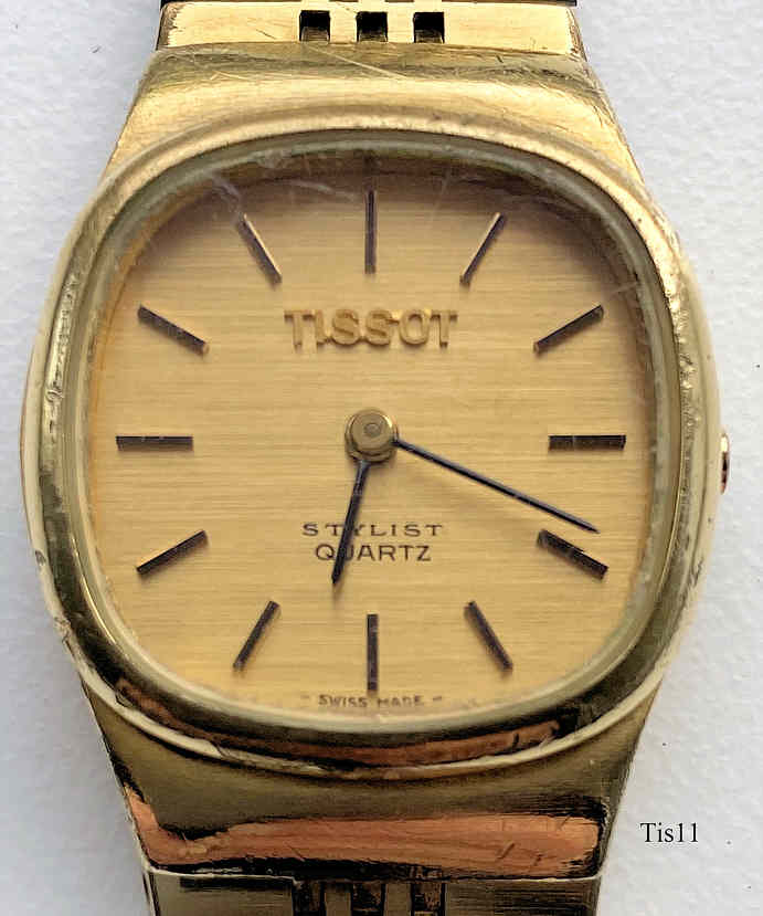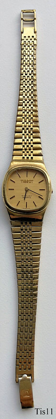 Eine Tissot Stylist Damen Quartz Uhr. Werk Caliber 2032, Werknummer 20956, Gehäuse vergoldet. Beschriftet vorn :”Tissot, Stylist, Quartz”, innen: ”Tissot, 20956, 2032, SSiH, unadjusted, two (2) Jewels, Swiss”, keine Beschriftung auf der Rückseite. Diese Uhr hat keine Krone, gestellt wird über einen Druckknopf und den Steppermotor.