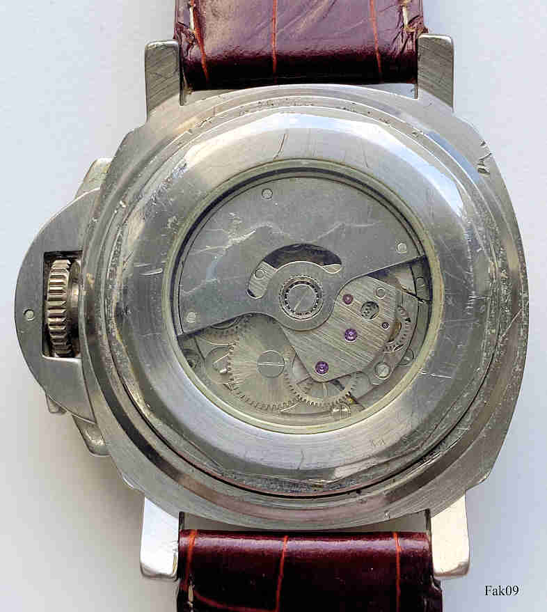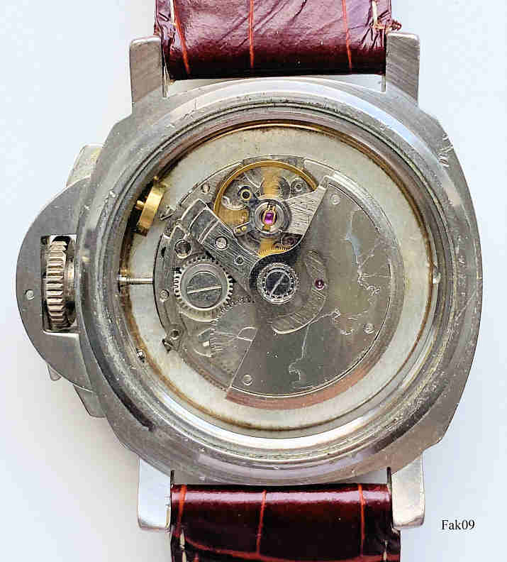 Dies ist ein nachgemachter Panerai Luminor Submersible, bei dem die Chronographen durch die Kalender Anzeigen ersetzt wurden, die Drücker dienen der Einstellung der Kalender. Innen ein recht ordentliches Automatic Werk mit Glasboden. Beschriftet: “€Panerai Submersible 1973”€. Braunes Lederarmband.