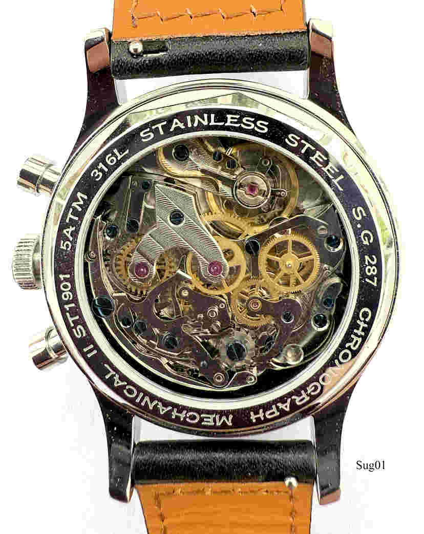 Ein Sea Gull (Möve) Schaltrad Chronograph der Tochterfirma Sugess (Seestern). Das Original Venus 175 wurde 1963 gebaut,Und die Marke mit allen Maschinen an Seagull.verkauft. Seagull entwickelte dann daraus ihr Kaliber 19, später 1901. Sugess verfeinerte das Kaliber dann durch einbau einer Schwanenhals Justage. . Beschriftet vorn: ”Sugess, Mechanical, Chronograph”, hinten:”Chronograph, Mechanical, II ST1901, 5 ATM, Stainless Steel, S.G 287”, innen: ” “€¯. Gehäuse aus Edelstahl, verschraubter Glasboden, Kaliber ST1901