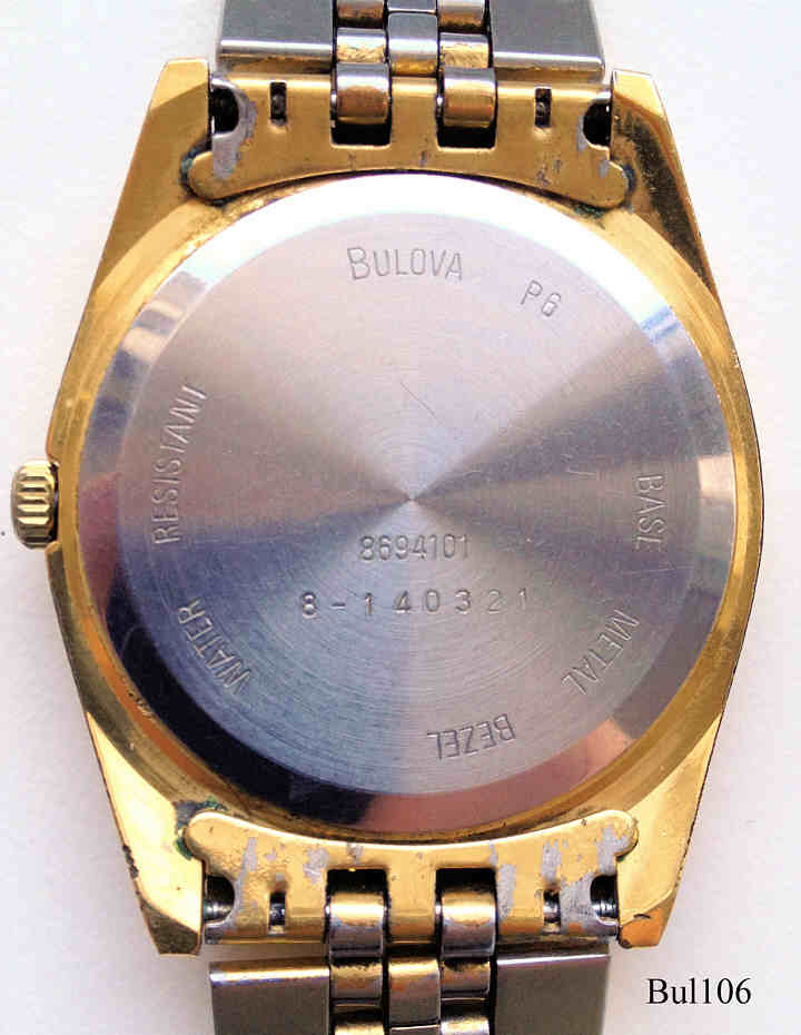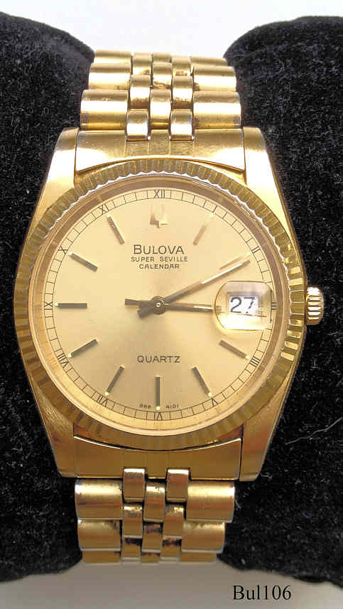 Bulova Super Seville Quartzwatch with a goldtone dial, date at 3 with loupe, signed front: “ Bulova, Super Seville, Calendar”, hinten: “BULOVA, P6, Water Resistant, Base Metal Bezel, 8694101, 8-140321”, Caliber ETA 555.115 .Production year 1986 (P6). Goldtone metal band with Bulova clasp.