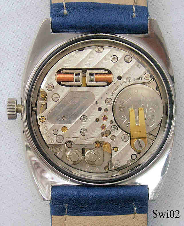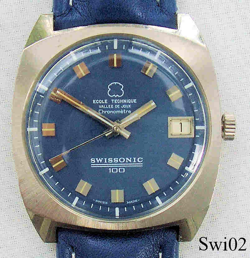 Dies ist eine Swissonic 100, Kaliber ESA 9162, Edelstahl Gehäuse, Edelstahl Rückwand, Kalender bei der 3. Bezeichnung auf dem Zifferblatt: ”Ecole Technique, Valle de Joux, Chronometre”, In der Rückwand: ”ETVJ, Waterproof, Stainless Steel”. Nach meiner Kenntnis ist diese Uhr das Lernobjekt in der Ausbildung für das Kaliber 9162 “MoSaBa” (Montre sans balance, Uhr ohne Unruh).Während des Lehrgangs wurde diese Uhr von den Uhrmachern aus Einzelteilen zusammen gebaut und justiert. Nach erfolgreichem Abschluß durften die Uhrmacher diese Uhr kaufen.