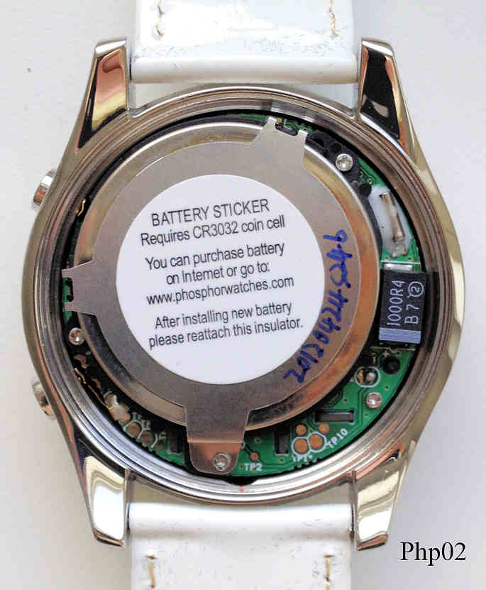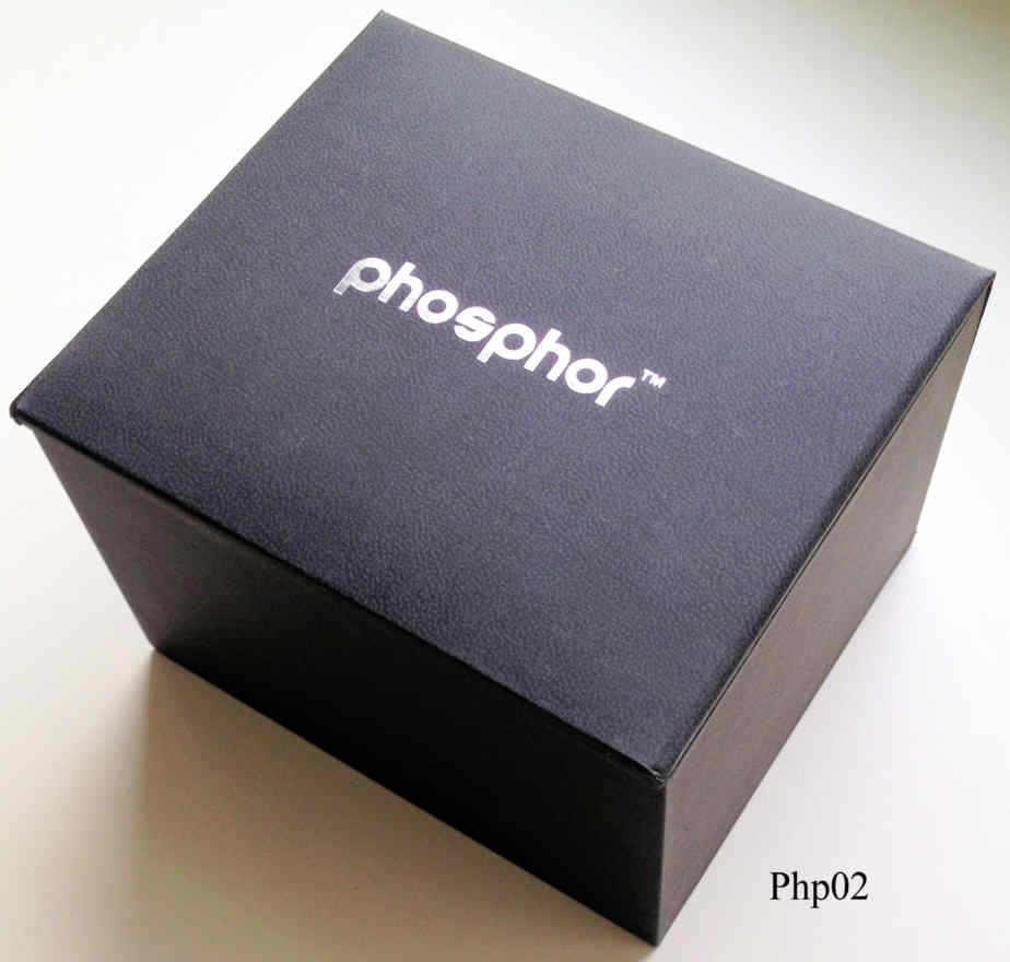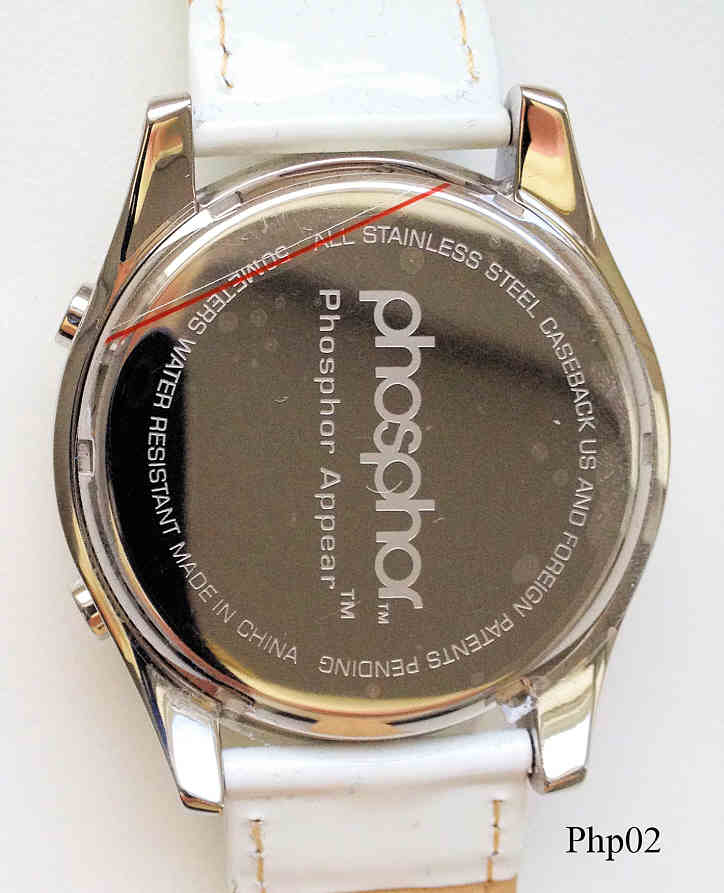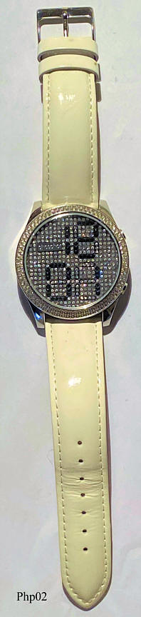 Eine ganz besondere Schmuckuhr von Phosphor, hier wurde eine neue Technik verwendet, genannt Micro Magnetic Mechanical Digital, dabei drehen sich Miniatur Rotoren, die mit hellen und dunklen Steinen belegt sind und stellen so die Segmente dar. Die Uhr zeigt entweder nur die Steine, die Zeit in 12 Stunden Anzeige oder die Sekunden. Beschriftet vorn: “ Phosphor”, hinten: “Phosphor, Phosphor Appear TM, All Stainless Steel Caseback, US and Foreign Patents Pending, 50 Meters Water Resistant, Made in China”. Weißes Lackleder Band.